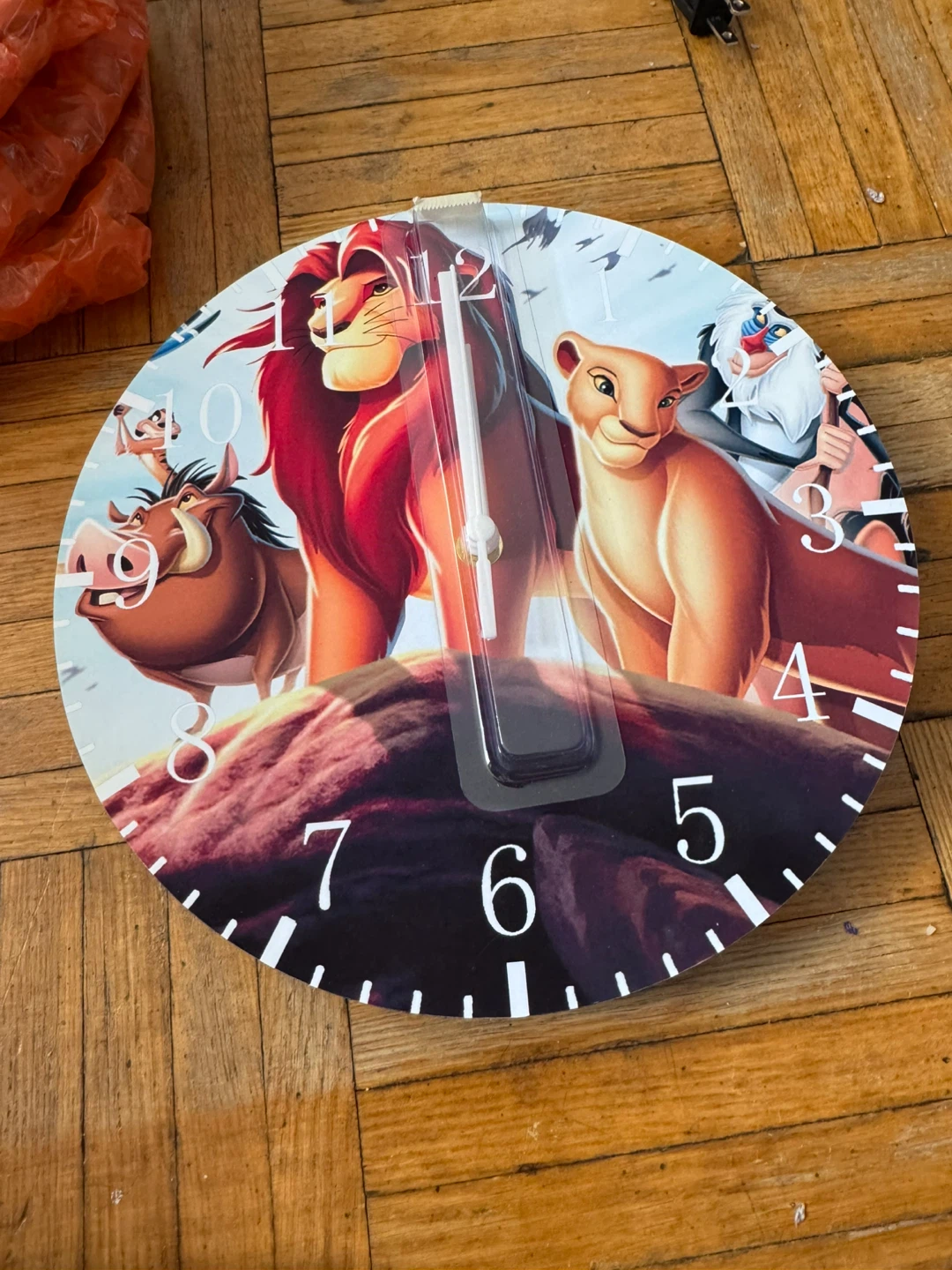 This round wall clock features characters from Disney's The Lion King. It has a quartz movement. Great for a child’s room or any fan of