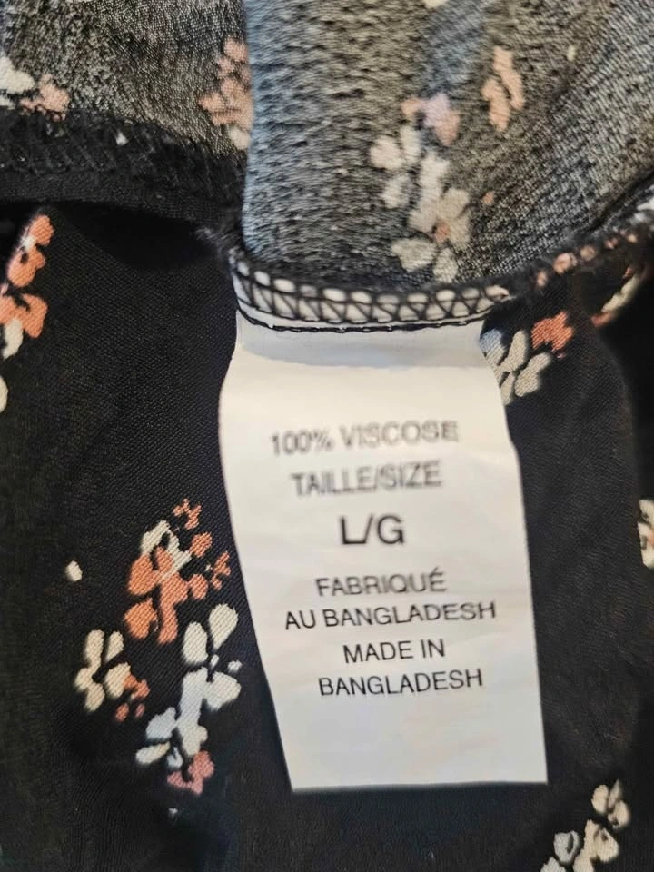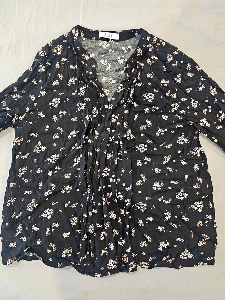 Cute SUZY long sleeve blouse. Black with pretty pink and white floral pattern. Made from 100% viscose, so it's super soft. Size Large.
