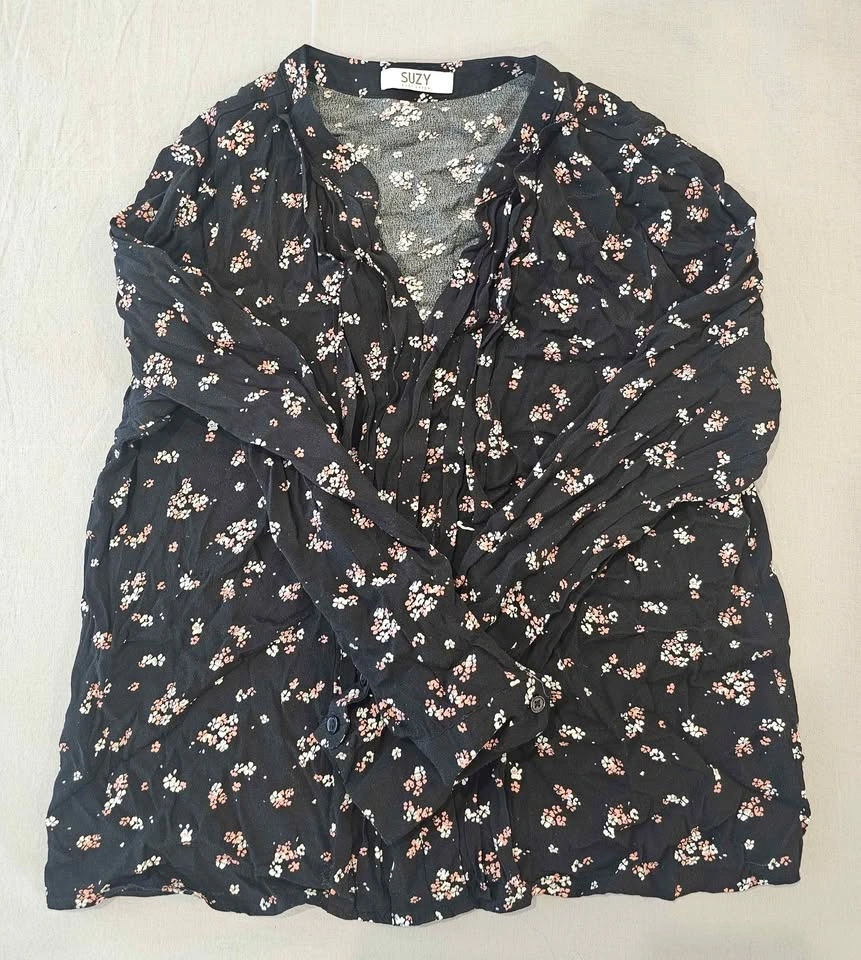 Cute SUZY long sleeve blouse. Black with pretty pink and white floral pattern. Made from 100% viscose, so it's super soft. Size Large.