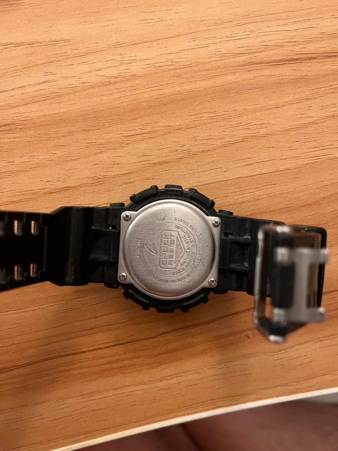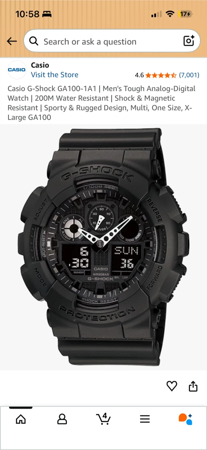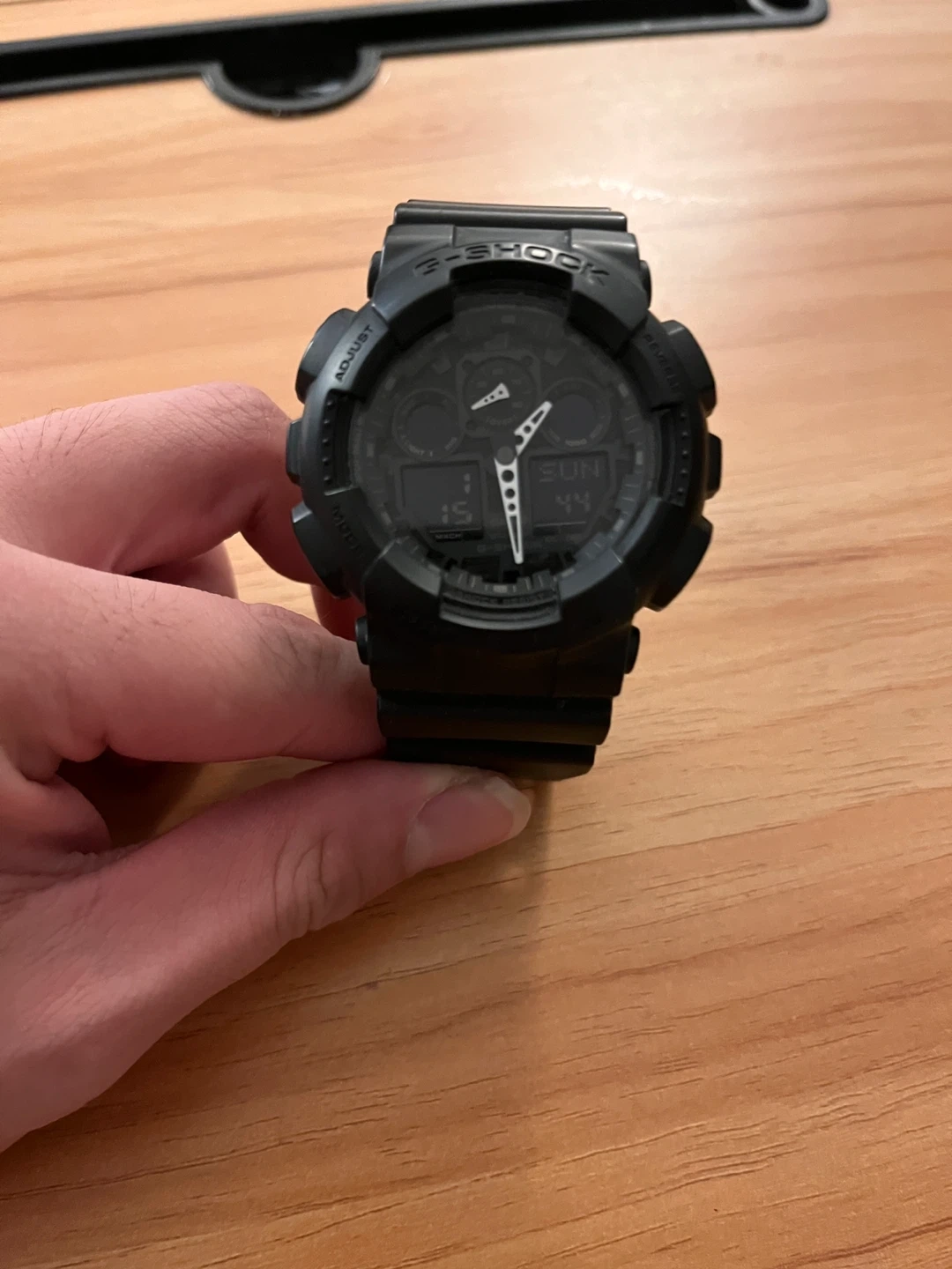 Black Casio G-Shock GA-100 men's analog-digital watch. Water resistant to 200m with shock and magnetic resistance. Black resin band and case.