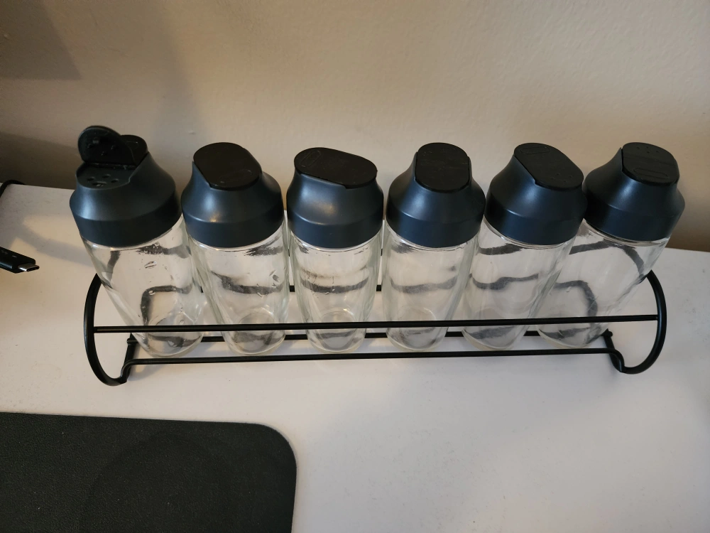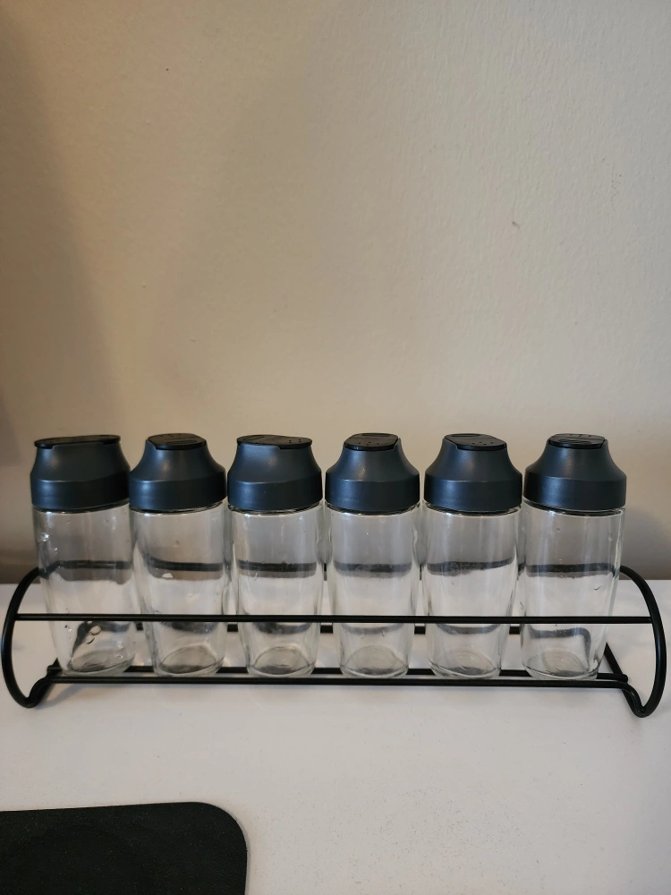 Set of six glass spice jars with black lids, mounted on a black metal rack. Perfect for organizing your spices.