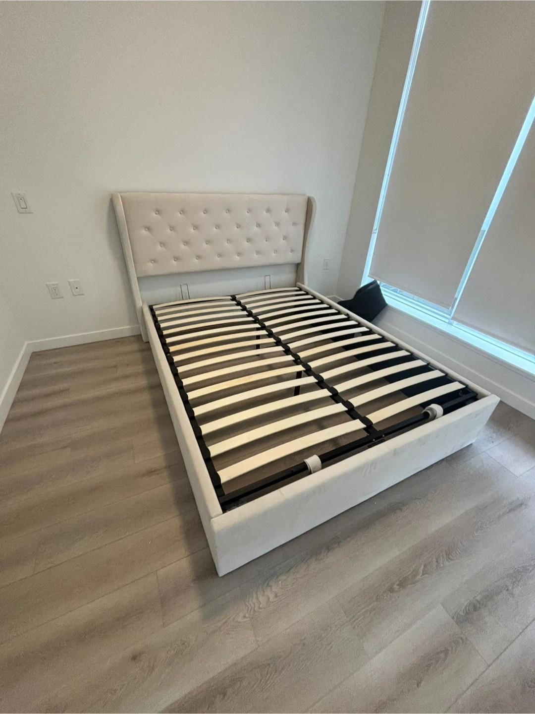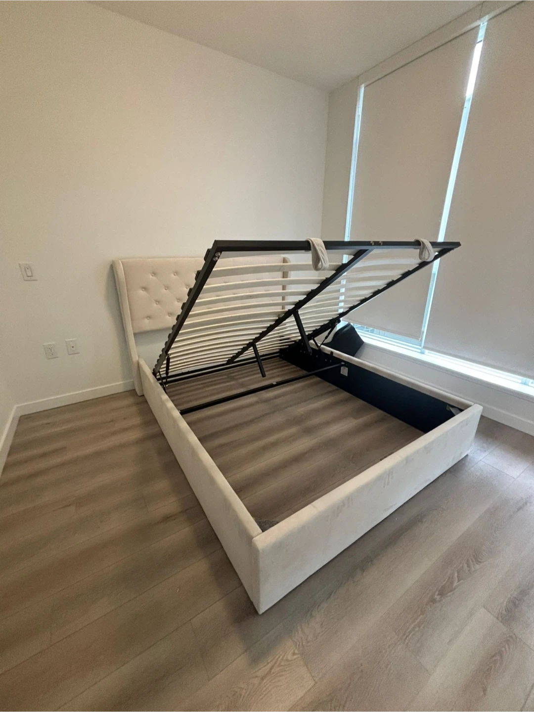 Beige Velvet upholstered bed frame with a tufted headboard. It features hydraulic lift storage under the mattress platform.