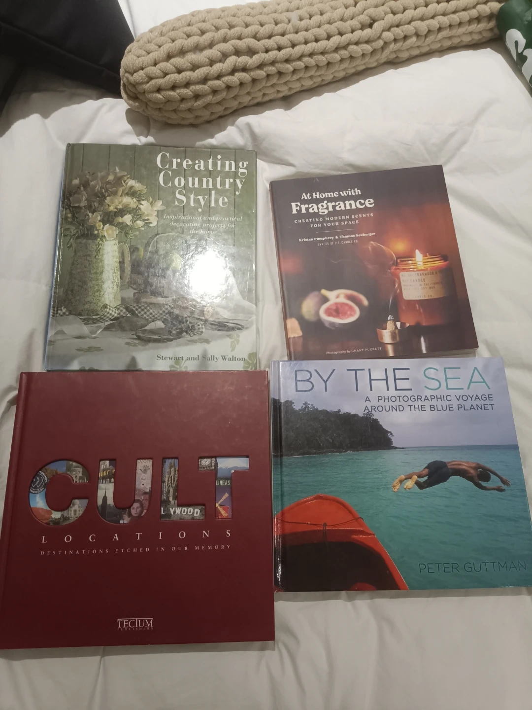 Four beautiful coffee table books covering home decor, fragrance, travel destinations, and ocean photography. They're perfect for adding inspiration to any living space. Includes 'Creating Country Style,' 'At Home with Fragrance,' 'Cult Locations,' and 'By the Sea.'