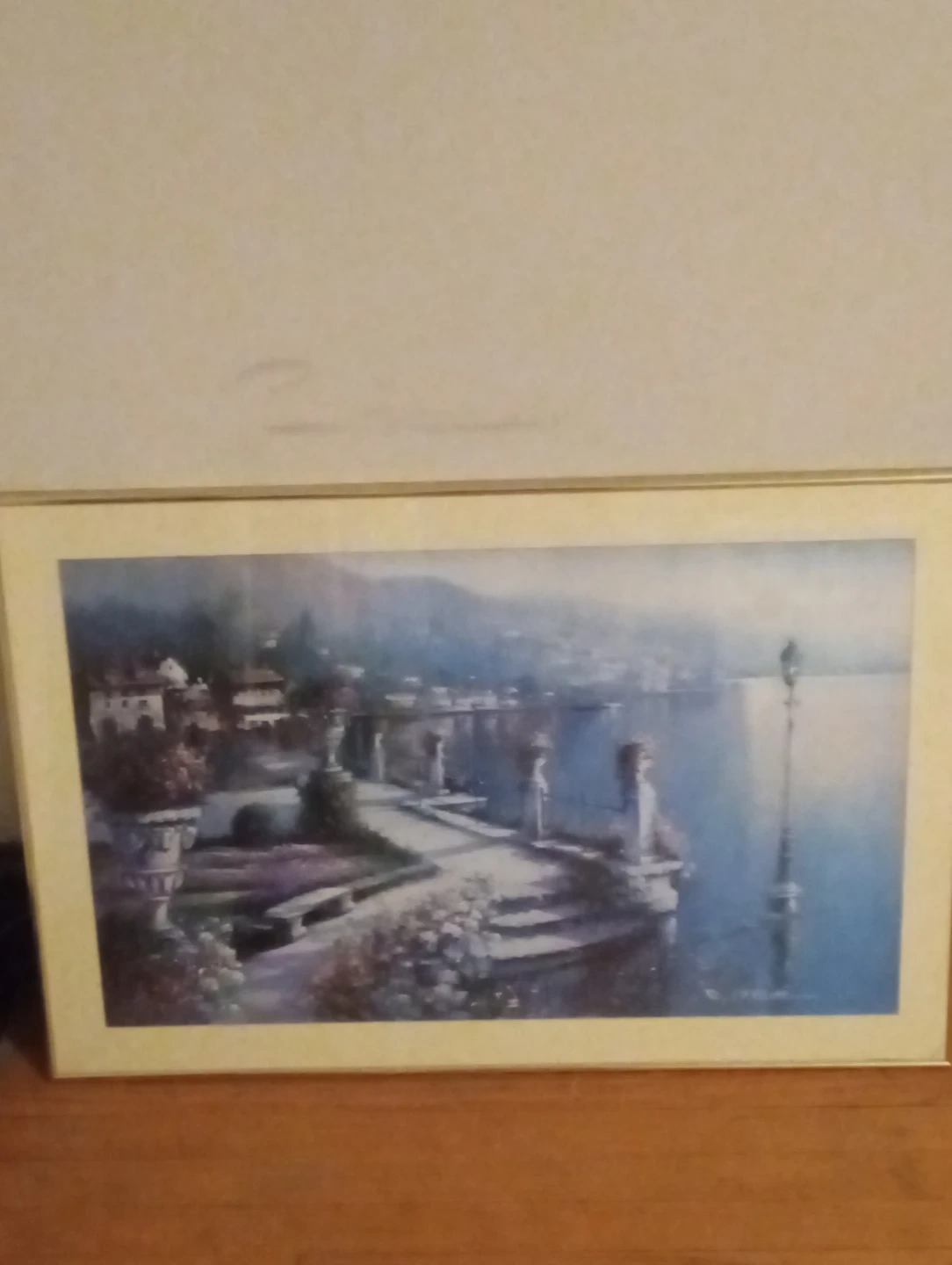 This framed art print depicts a scenic landscape with a lake and buildings. It's a beautiful addition to any room. The print is housed in a light-colored frame.