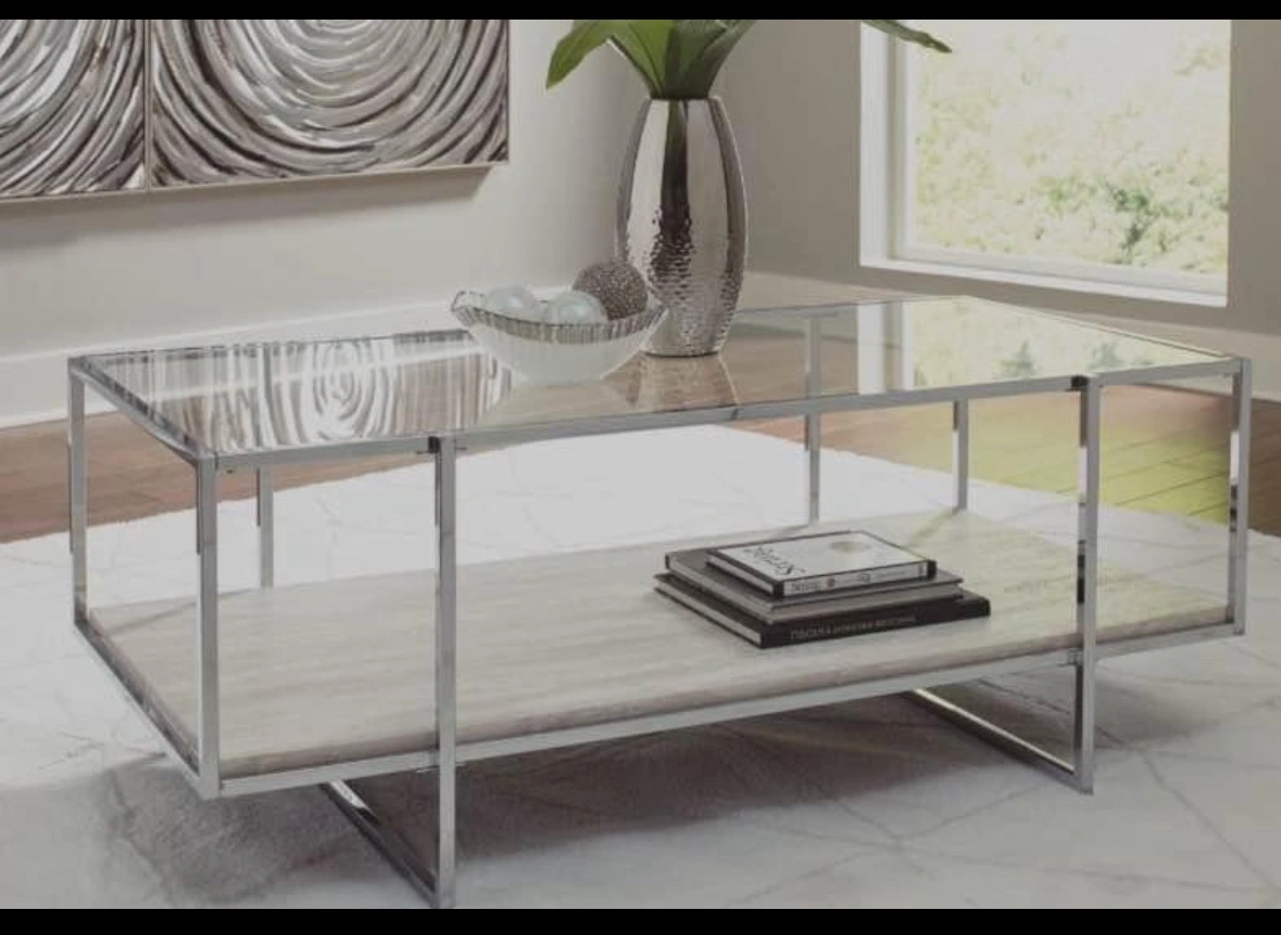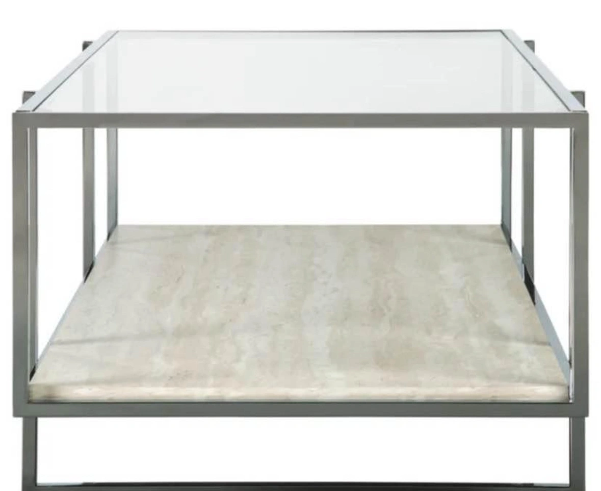 Contemporary style gets a modern attitude in this cocktail table. A tempered glass top showcases the replicated travertine stone shelf. The box design of the metal frame creates open space to offer the illusion of more room.