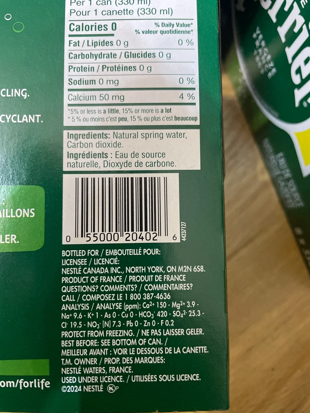 Perrier L'Original sparkling natural mineral water. This product contains zero calories and zero sodium. Ingredients are natural spring water and carbon dioxide.