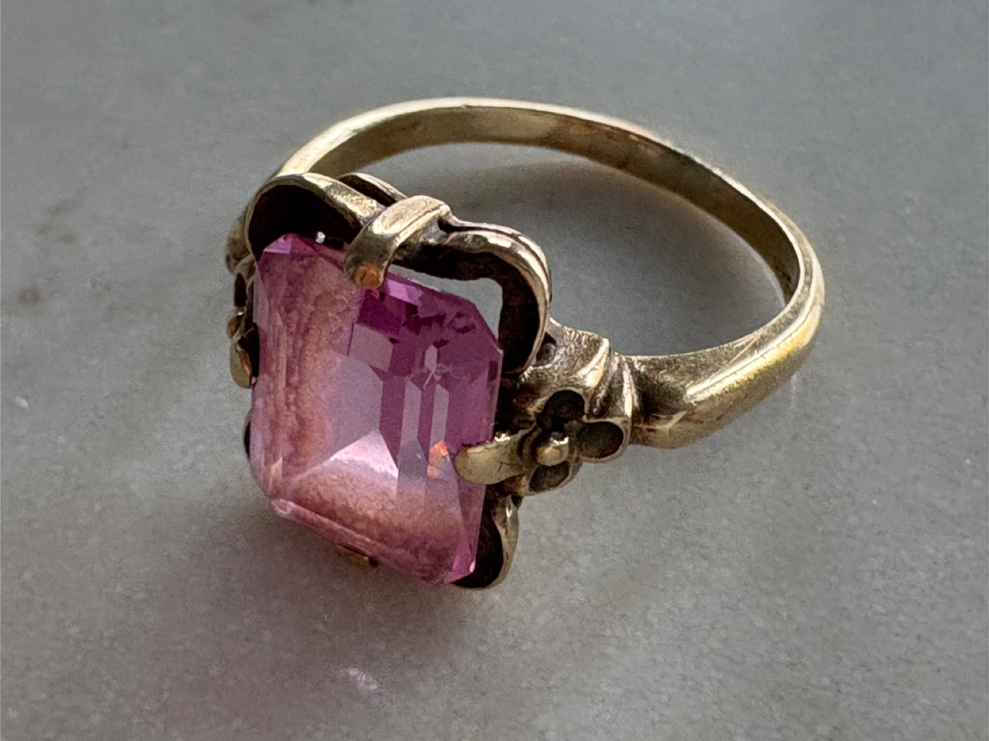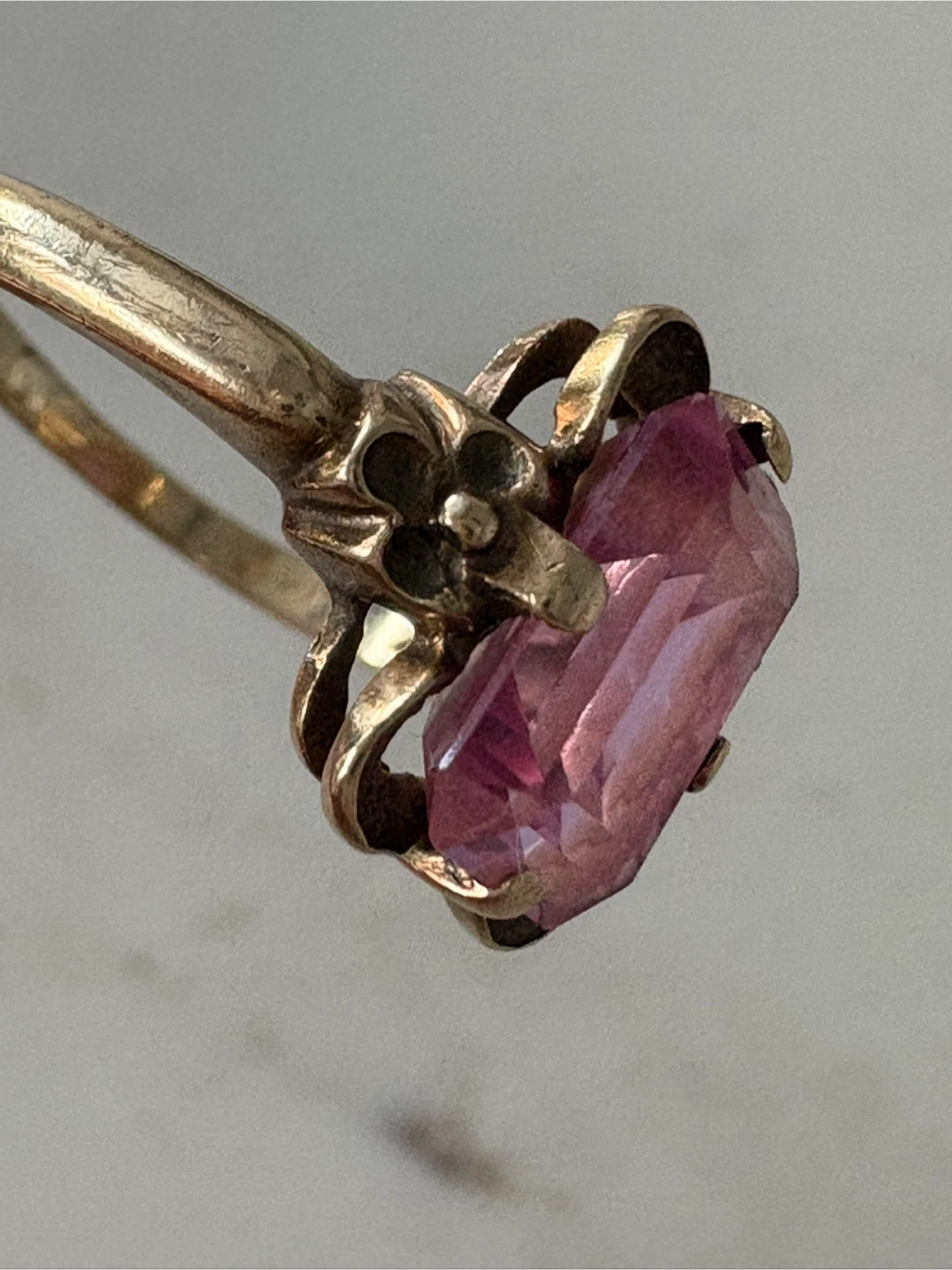 Beautiful Vintage 70s SID-BAR Emerald Cut Synthetic Pink Spinel & 10K Yellow Gold Cocktail Ring