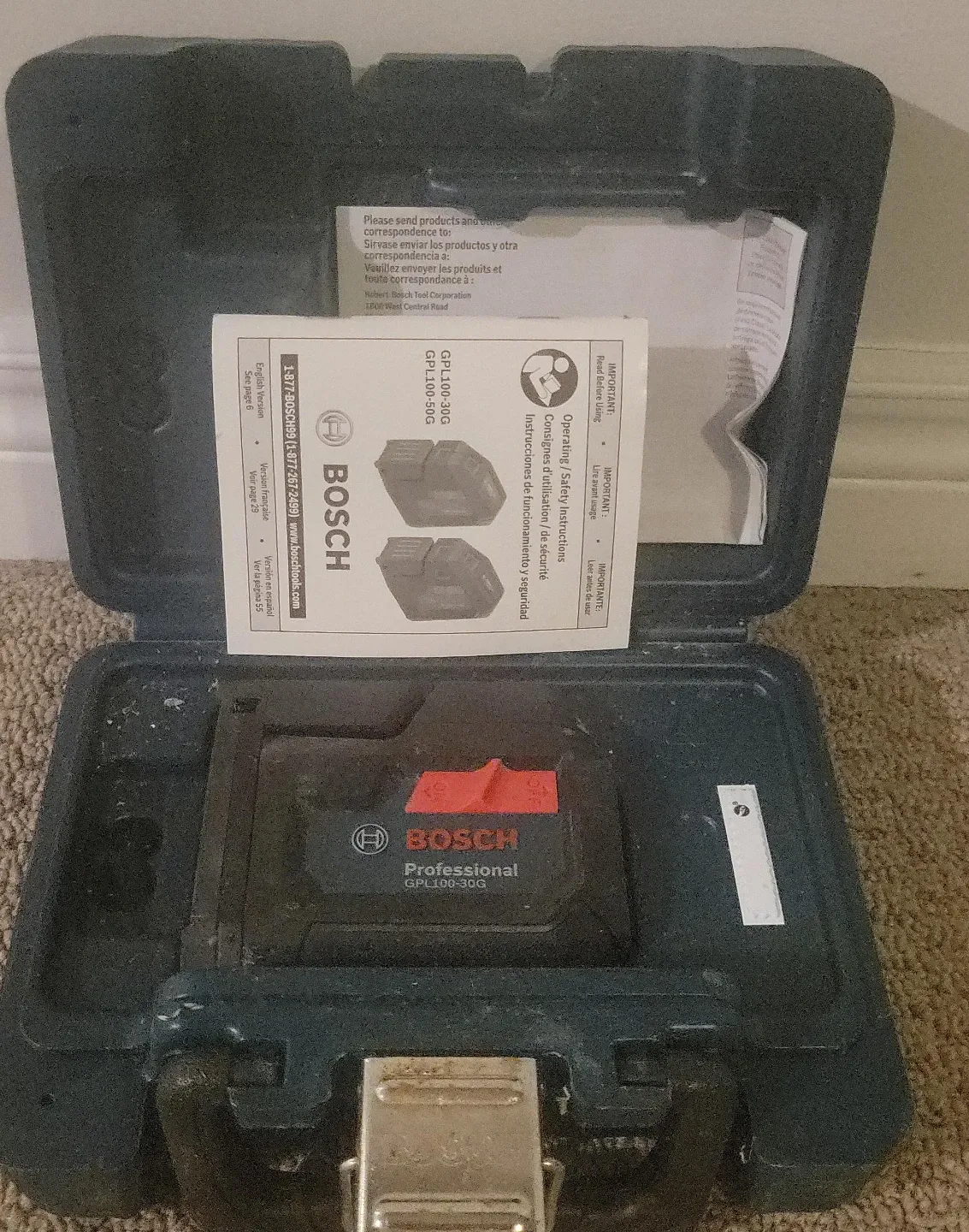 This is a Bosch Professional GPL100-30G laser level. It's in its original case. Operating and safety instructions are included. This tool is for professional use.
