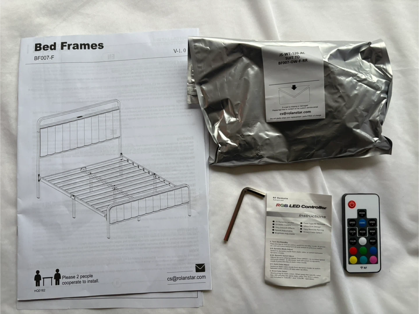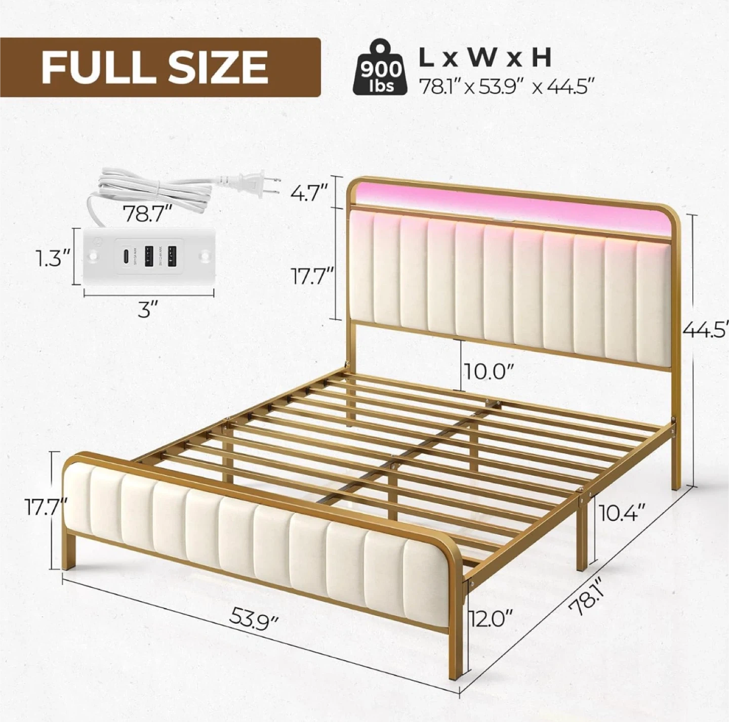LED light strip to light up your bedroom! It features 20 colours, 21 dynamic modes, 8 speeds and 8 brightness settings, all controlled by a remote. The bed frame measures 78.1" x 53.9" x 44.5". It also includes a USB charging station and under-bed storage space.