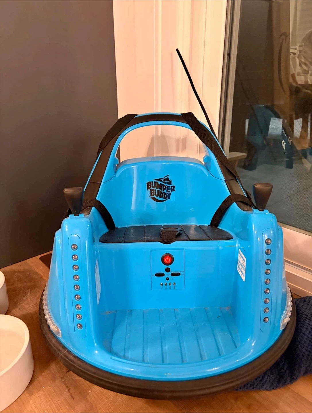 Bumper Buddy ride-on toy in bright blue. It features a safety harness and a power button. Suitable for children to enjoy fun indoor rides or fun for outdoor activities.