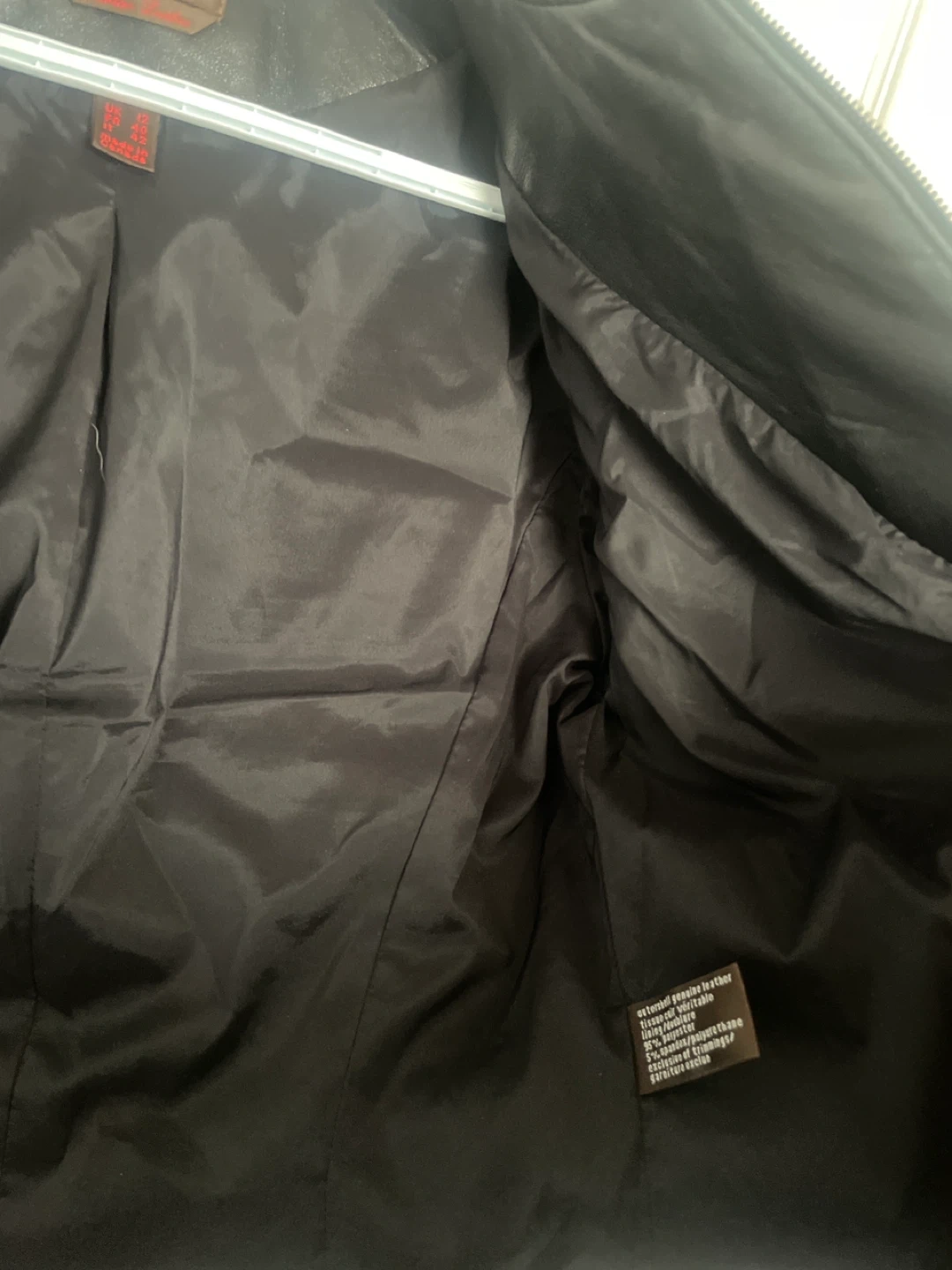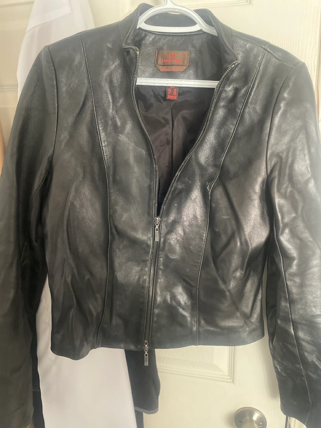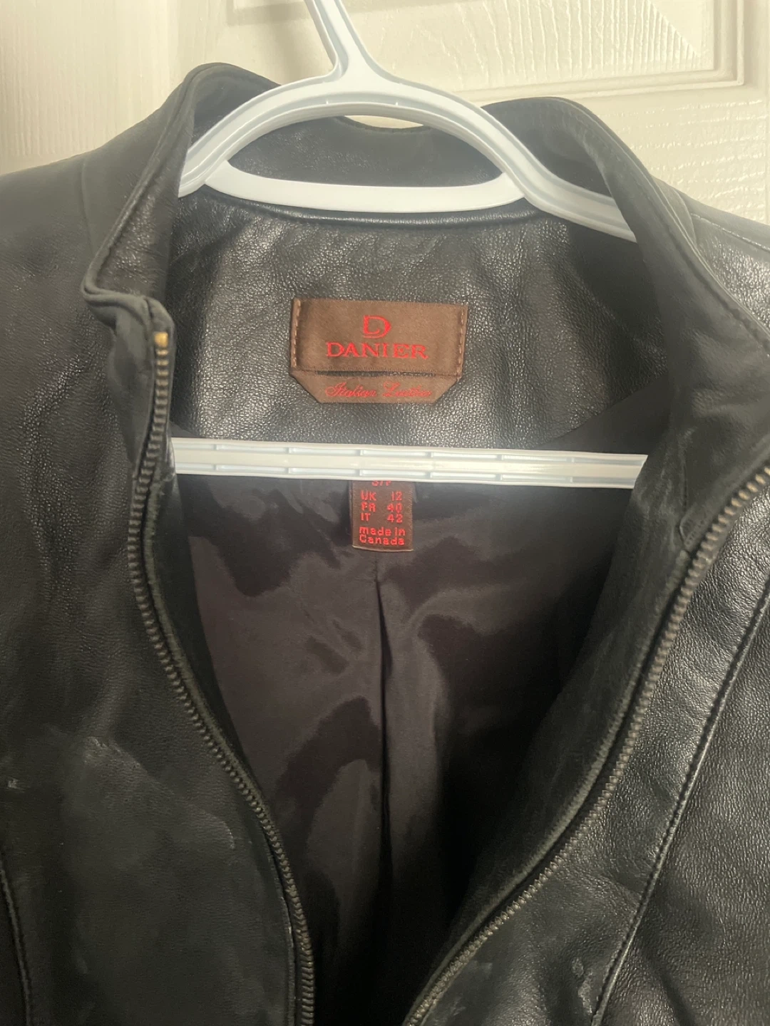 This is a stylish black leather jacket from Danier. It features a full zip front and is made from genuine leather. Size is US 10, UK 14, FR 42.