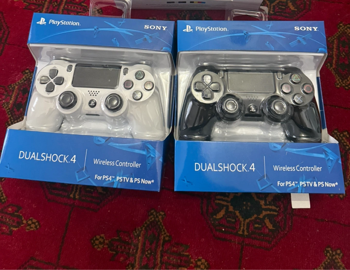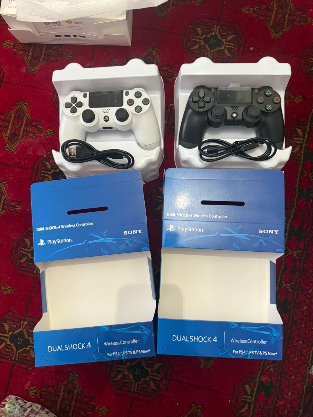 DualShock 4 wireless controllers, one white and one black. These are compatible with PS4, PS TV, and PS Now. Each controller comes with its charging cable and original packaging.