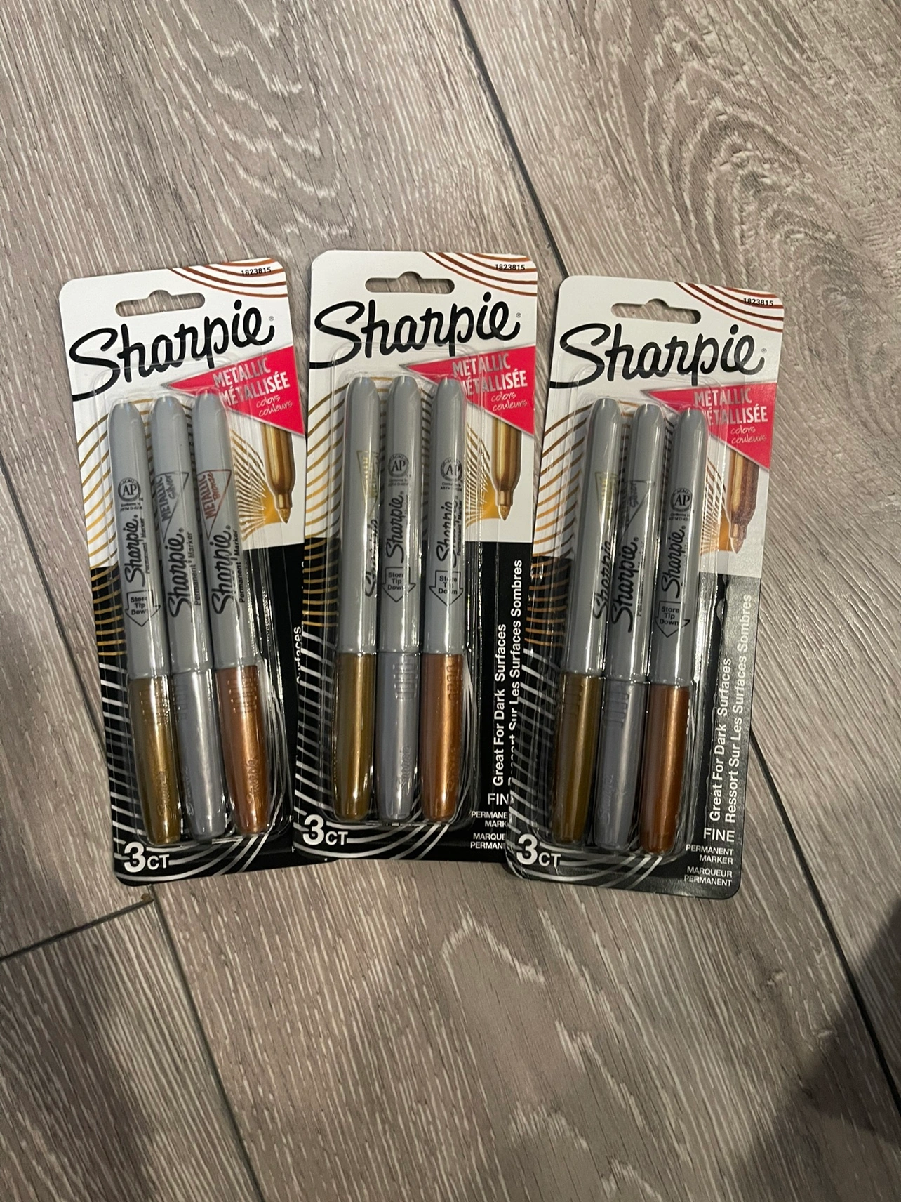 I have three packs of Sharpie metallic markers for sale! Each pack contains 3 fine point markers, perfect for adding a little shine to your projects. They're great for dark surfaces and are permanent markers. Brand new in packaging!