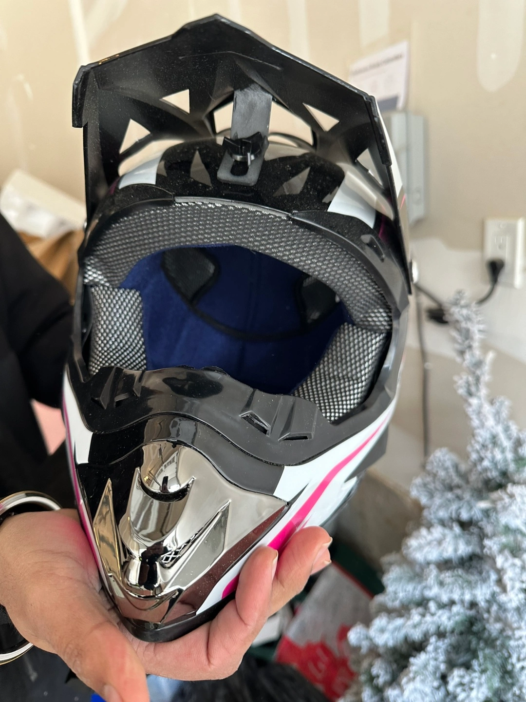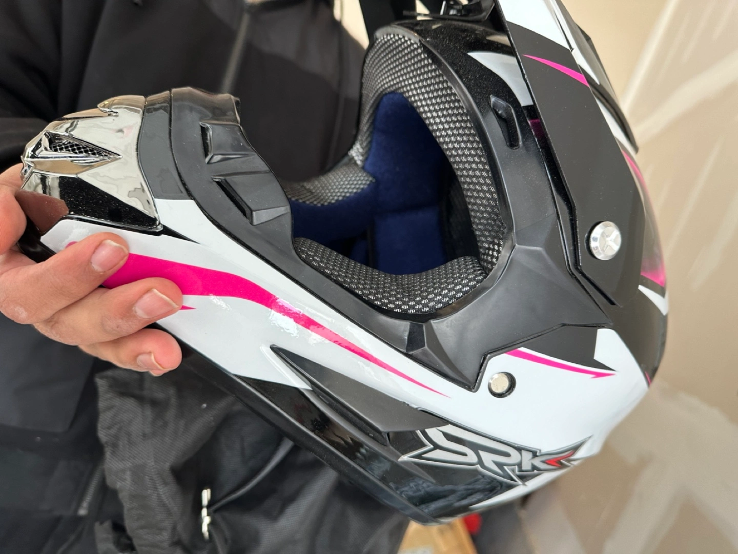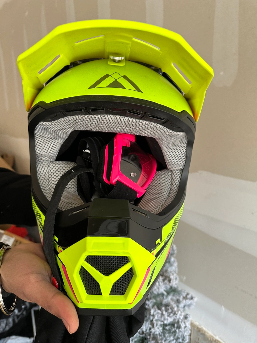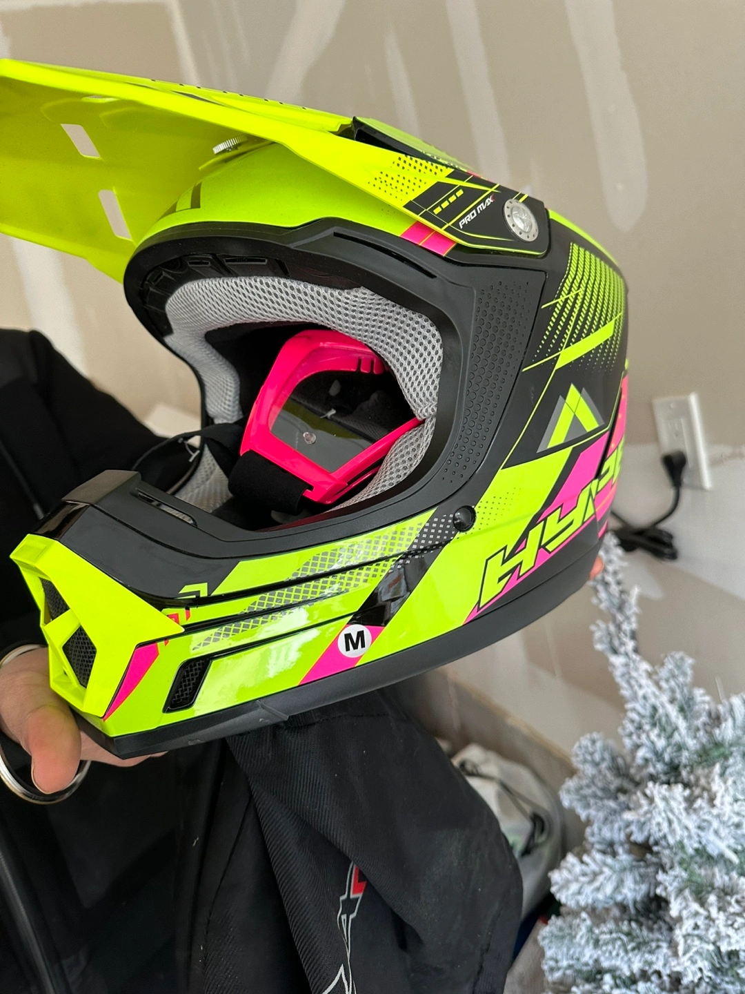 Youth motocross helmet, size medium. Bright yellow and black with pink accents. Includes goggles. Helmet has a peak.