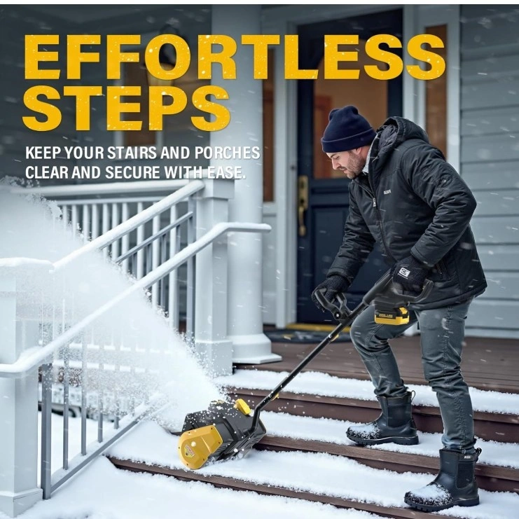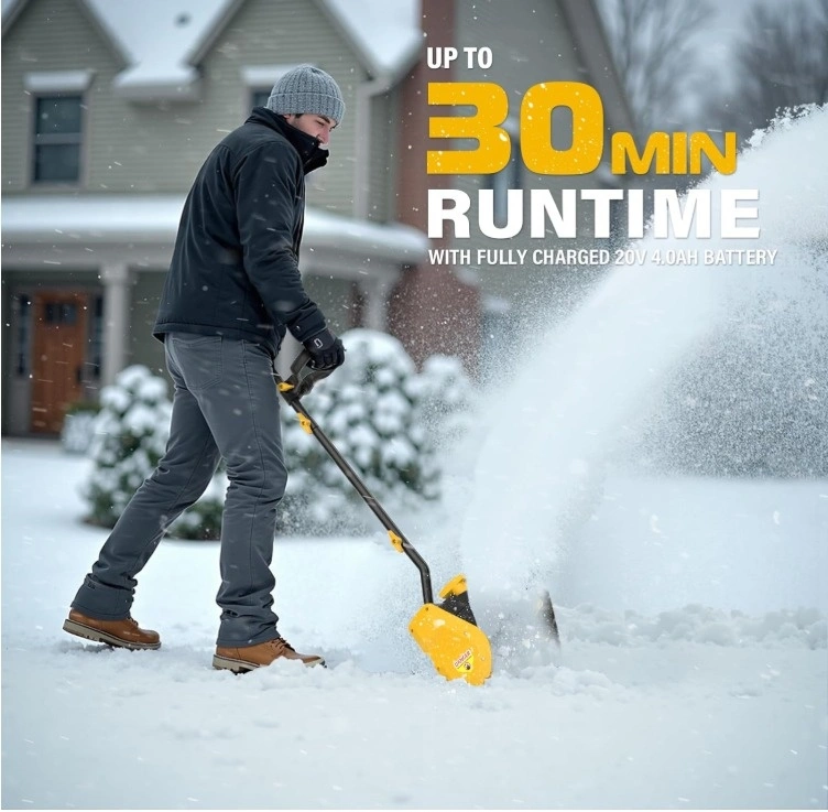 This cordless snow shovel has a strong motor powered by a 20V rechargeable lithium battery pack (not included), offering a maximum runtime of 30 minutes. The guide plate can be changed by +/- 30 degrees to direct snow where you want it. The built-in LED light provides visibility for clearing snow at dawn and dusk. It has a dual-action button to prevent accidental activation. The adjustable handle offers a comfortable grip for easier snow removal. It's cordless and weighs only 8.7 pounds, making it easy to handle. Ideal for driveways, steps, patios, decks, walkways, and paths. It operates quietly.