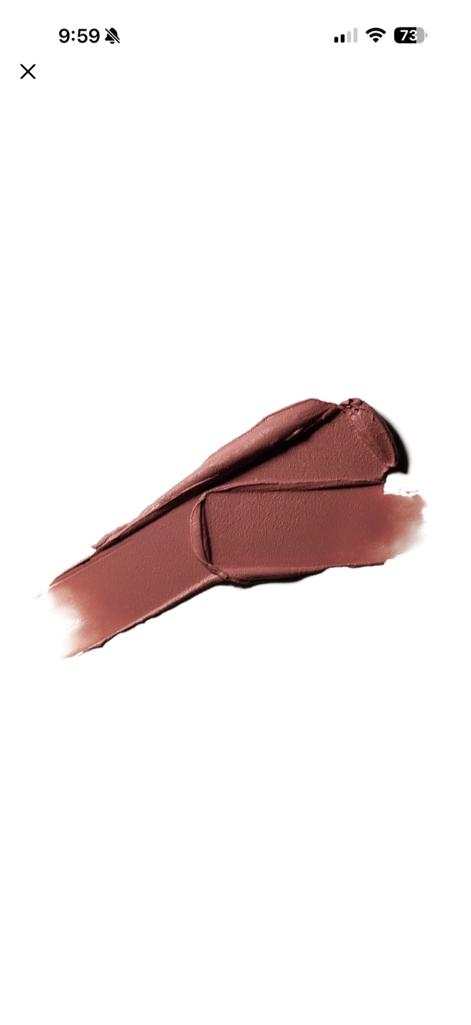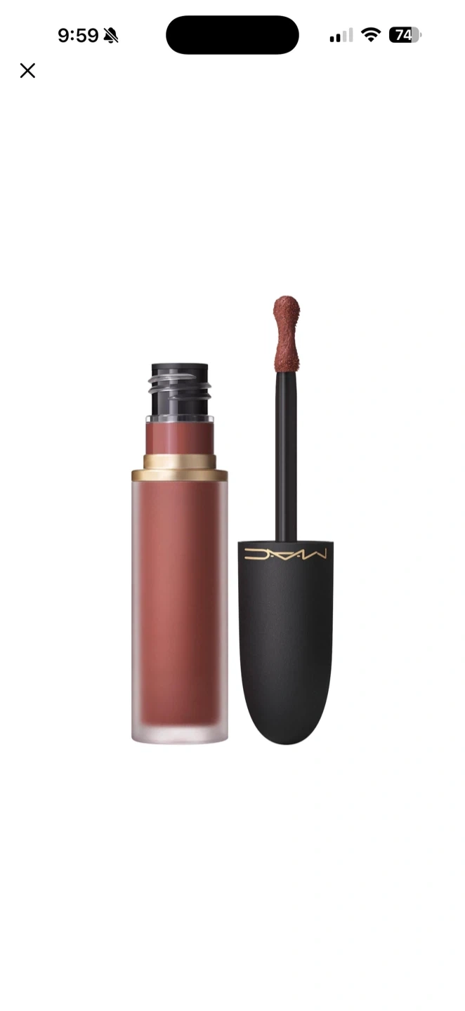 A matte liquid lipstick from MAC Cosmetics in the shade Topped with Brandy. It's a long-wearing formula that dries down to a velvety finish. This shade is a muted rosy-brown.