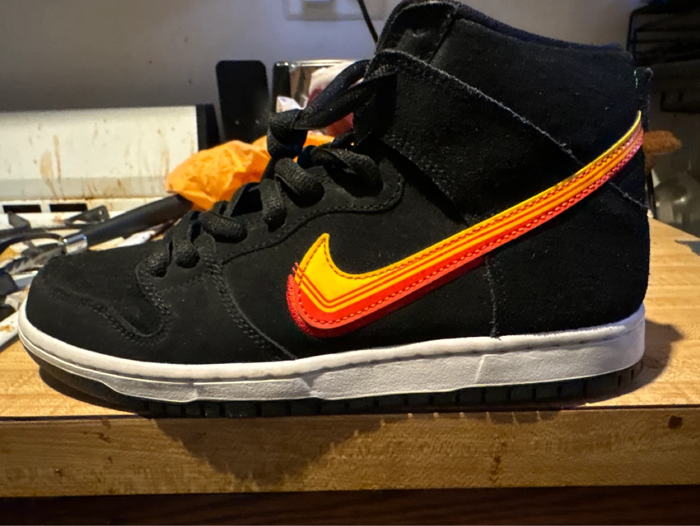 🥕size 8 men’s .Black suede high-top Nike SB Dunk sneakers. Features a multi-layered red, orange, and yellow swoosh. White midsole with black outsole. Wellington and Halsted here. Zelle or cash