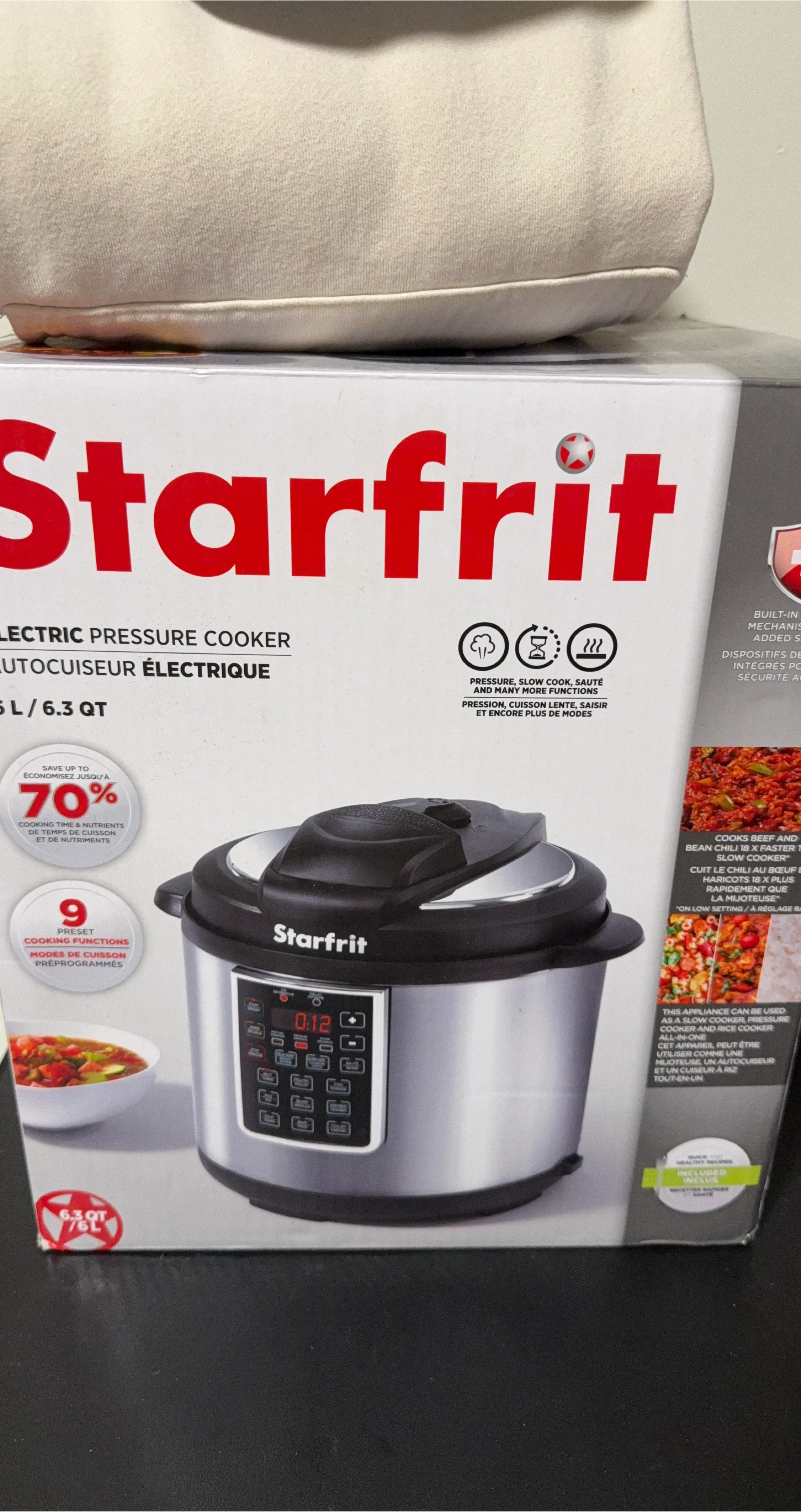 Selling a Starfrit electric pressure cooker with a 6L capacity. It's in great shape and ready to help you cook delicious meals! It can save up to 70% on energy and has 9 preset cooking options