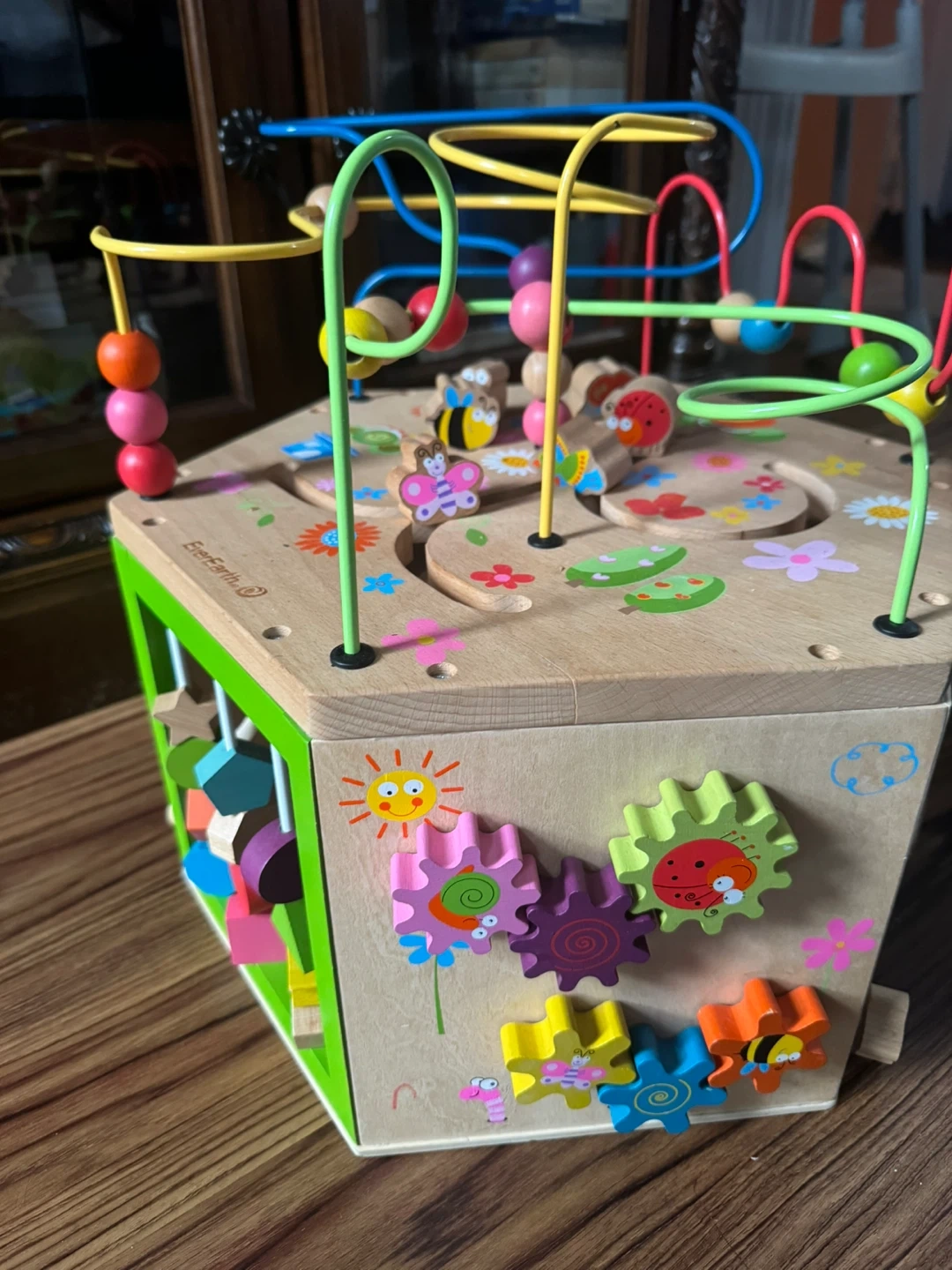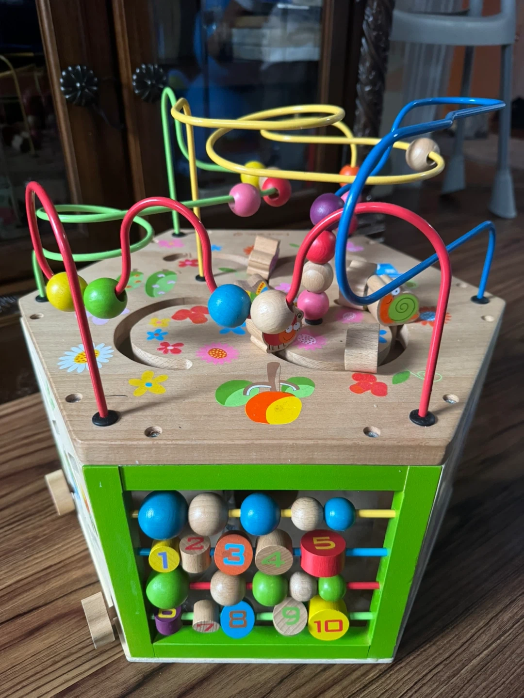 This wooden activity cube offers multiple play panels for little ones. It features bead mazes, gears, and an abacus with numbers. It's a great way to develop fine motor skills and early learning concepts.