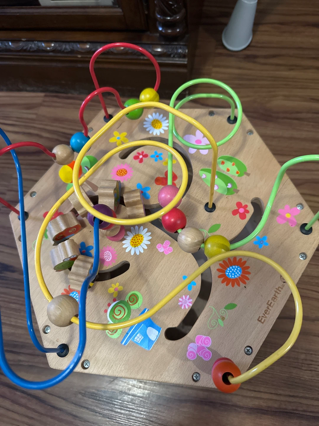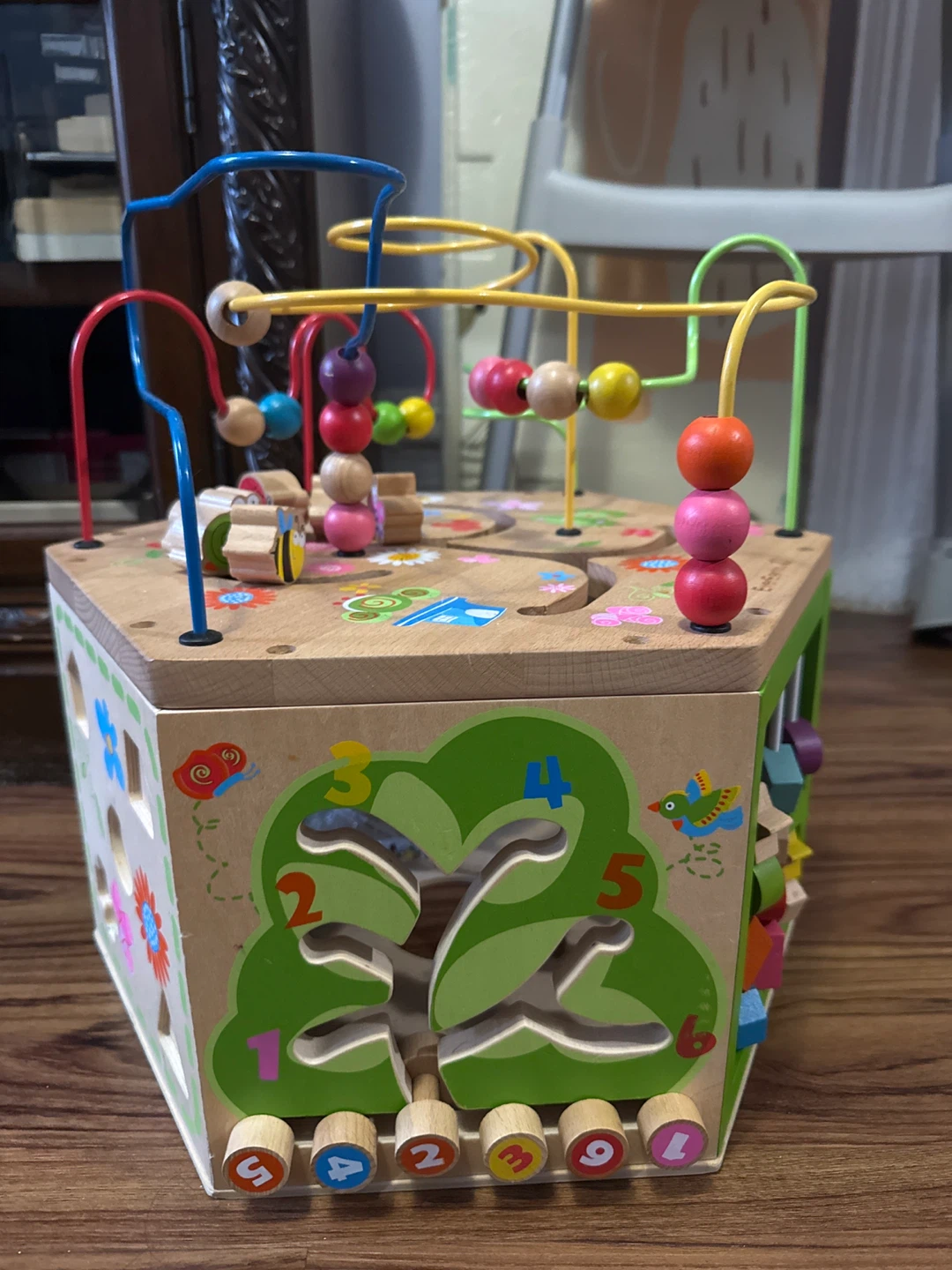 This wooden activity cube offers multiple play panels for little ones. It features bead mazes, gears, and an abacus with numbers. It's a great way to develop fine motor skills and early learning concepts.