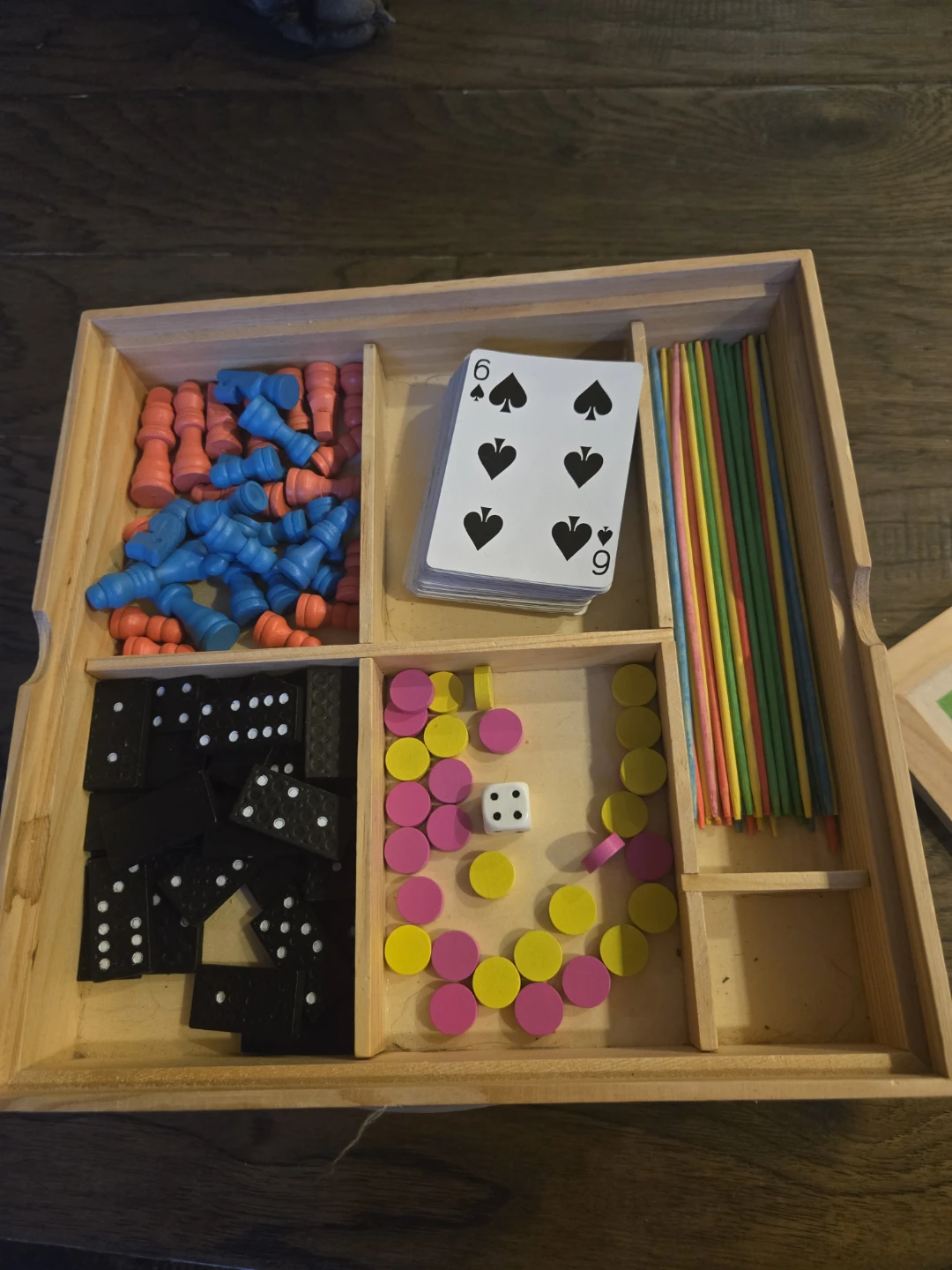 Selling a wooden games compendium set! It includes a variety of classic games like chess, dominoes, cards, and pick-up sticks. All pieces are included and in good condition, perfect for family game nights or to keep the kids entertained on a rainy day