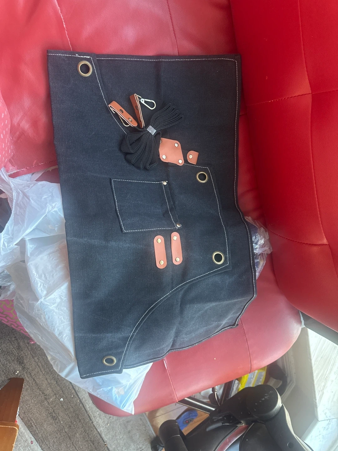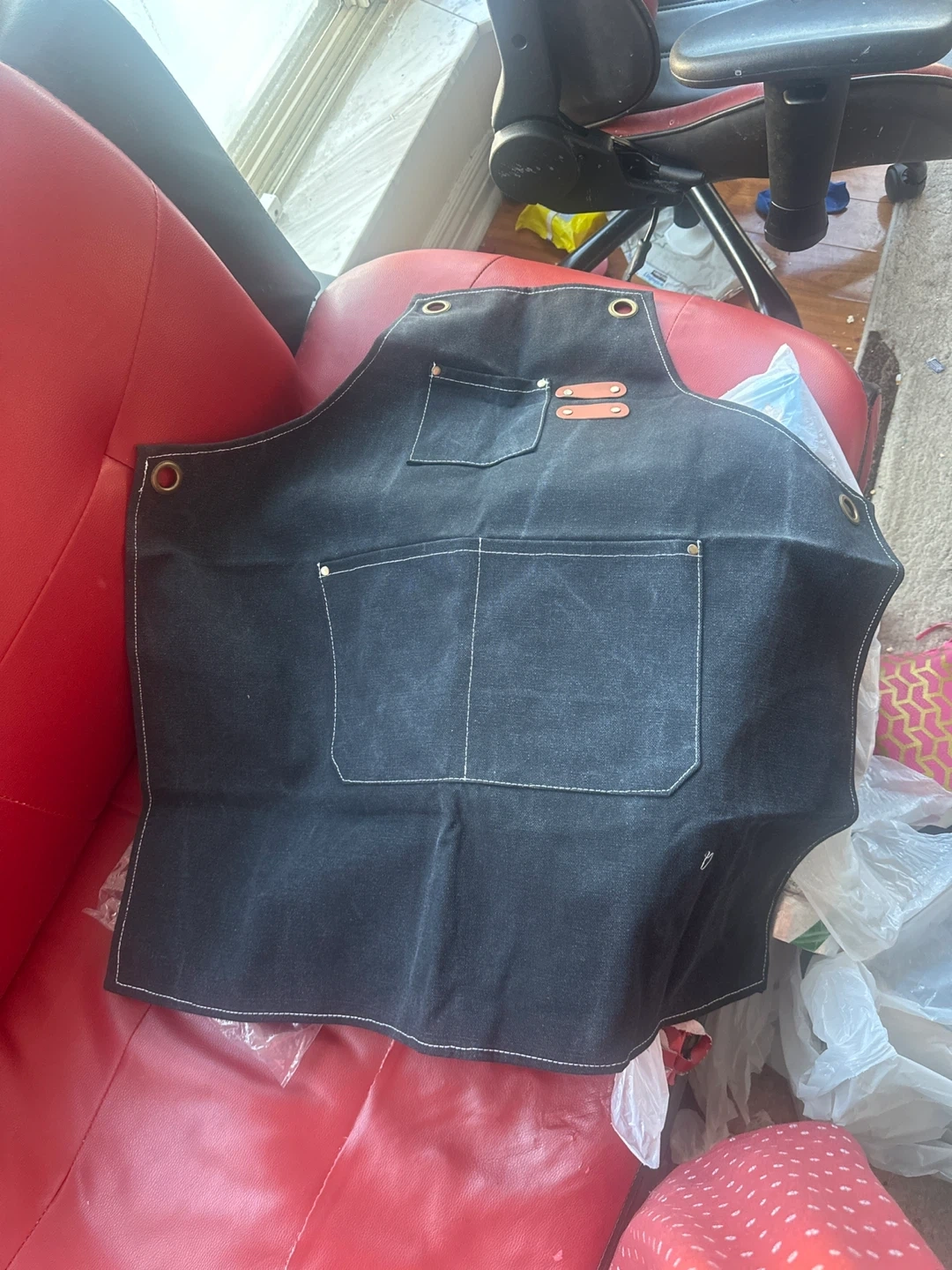 A durable black canvas apron designed for work. It features multiple pockets for tools and supplies. Adjustable straps ensure a comfortable fit for various tasks.