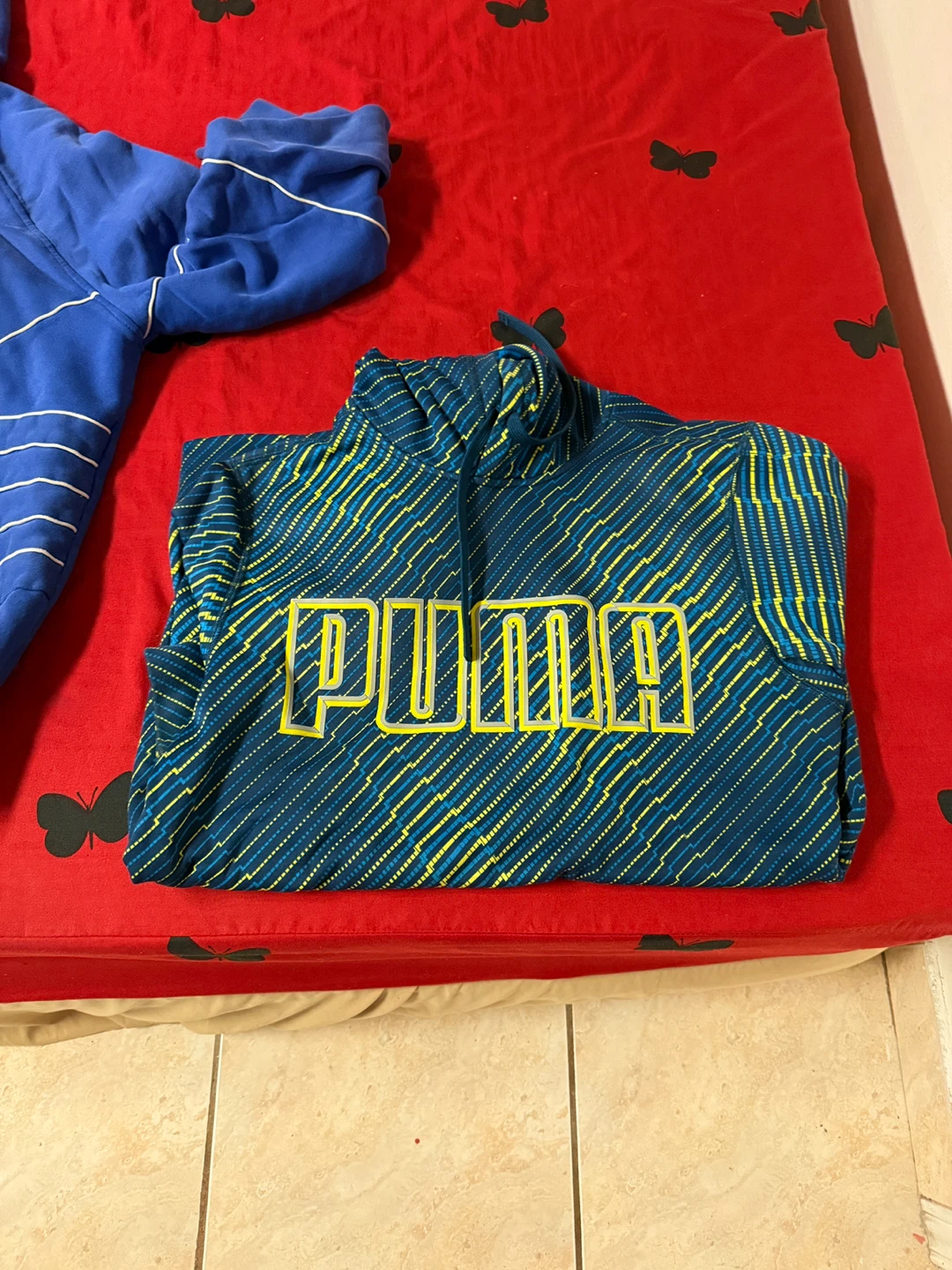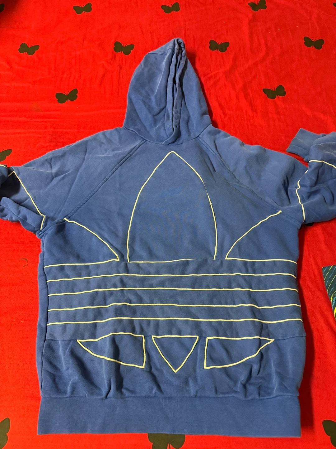 Selling a blue Adidas hoodie. It's in great condition and has a cool design on the back! Perfect for staying cozy on cooler days