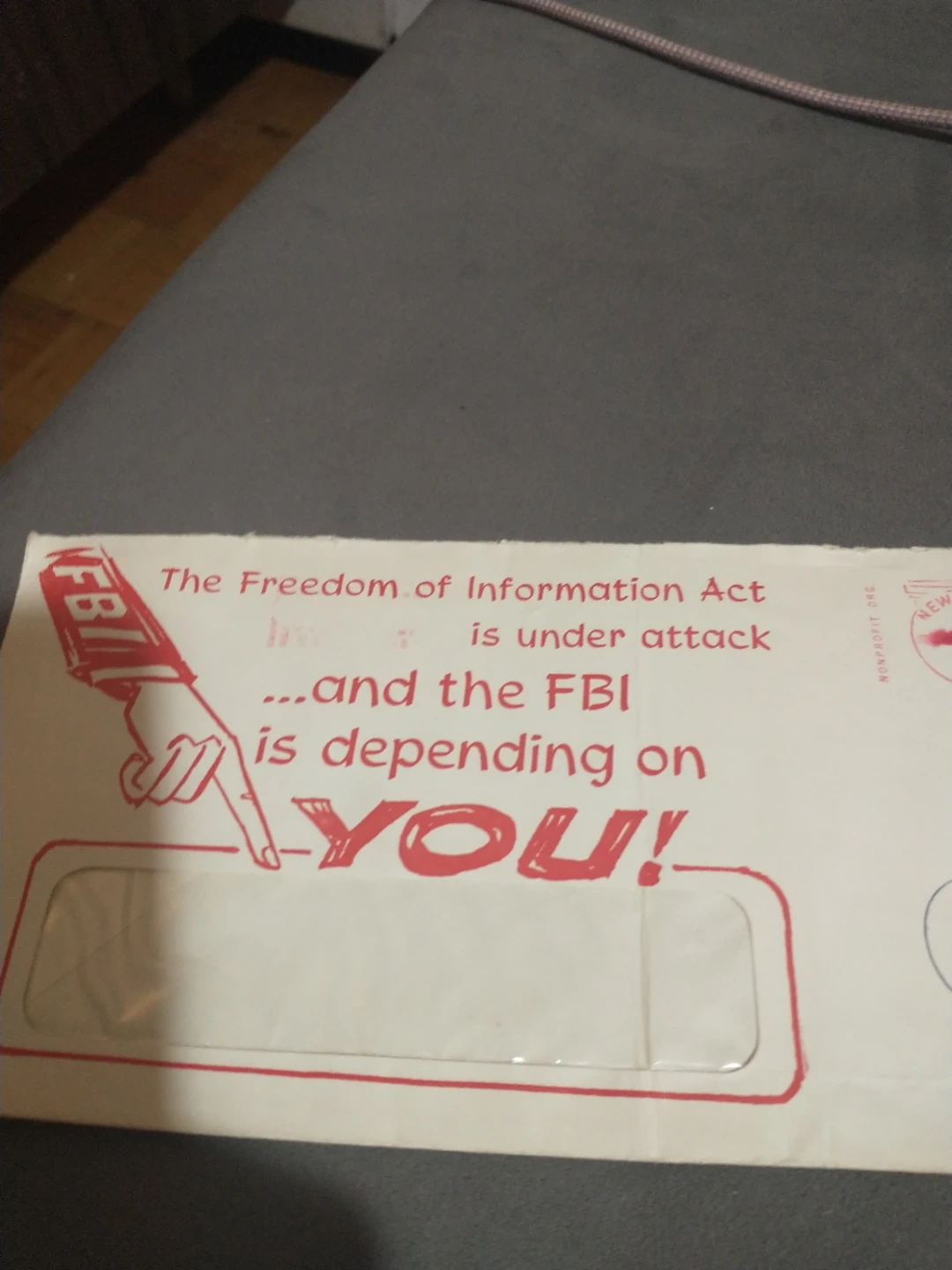 1970s FBI fundraising envelope NYC to Miami. The redacted postage meter date has been marked out with red ink. FBI, eh? In box 5.