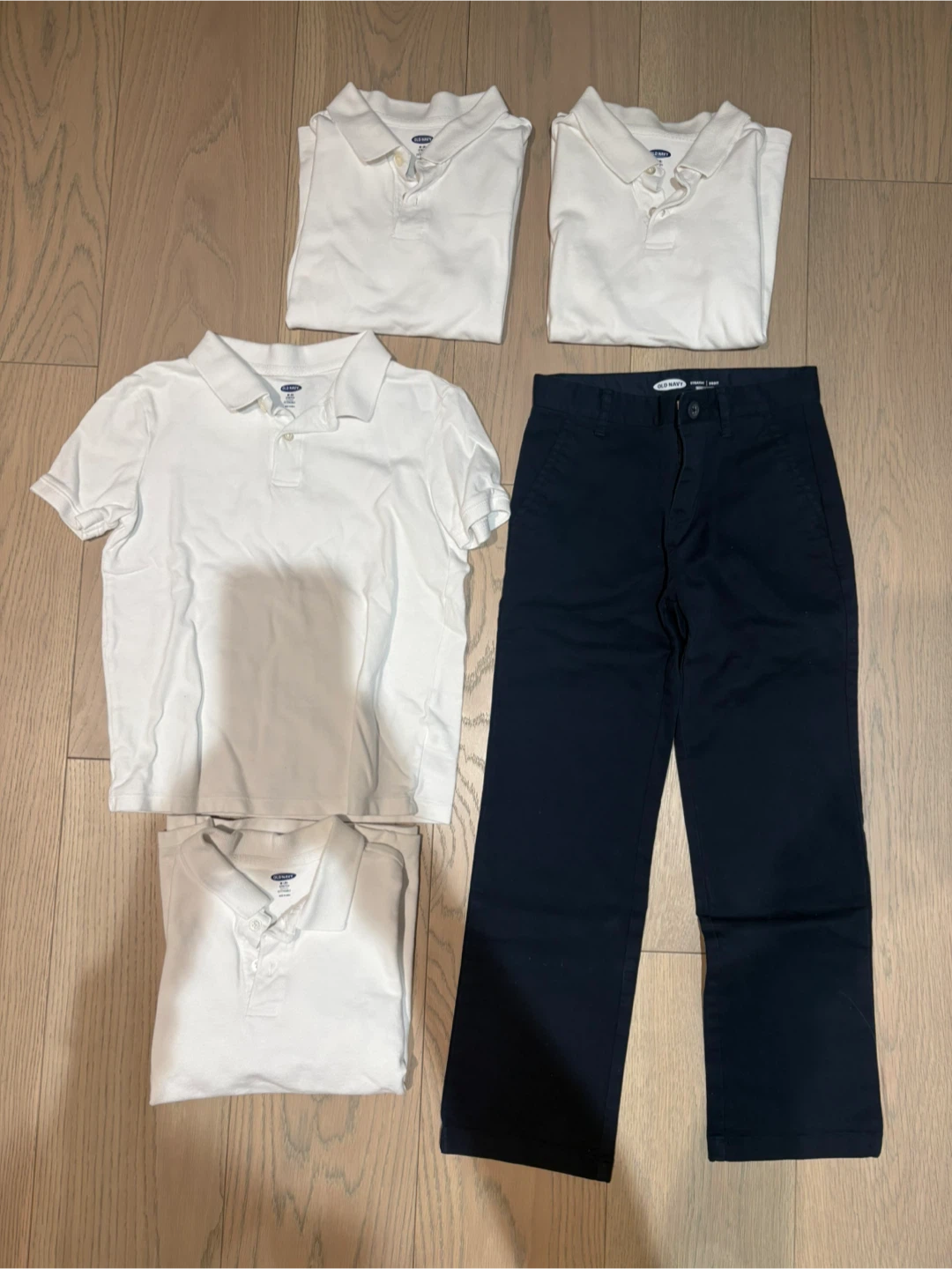 Bundle of Old Navy uniform essentials for kids. Includes four white short-sleeve polo shirts and one pair of navy blue straight-fit uniform pants. Pants feature Built-In Flex technology. Great for school days!
