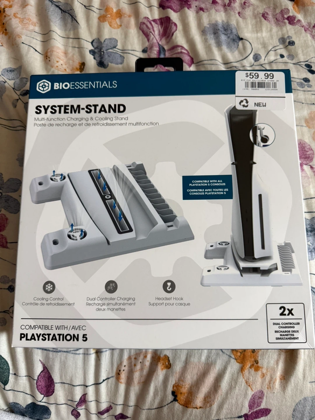 Selling a brand new BioEssentials System-Stand for the Playstation 5! This multi-function charging and cooling stand is perfect for keeping your console organized and cool. It features dual controller charging, a headset hook, and cooling control. Originally bought for $59.99 + tax. Box included!