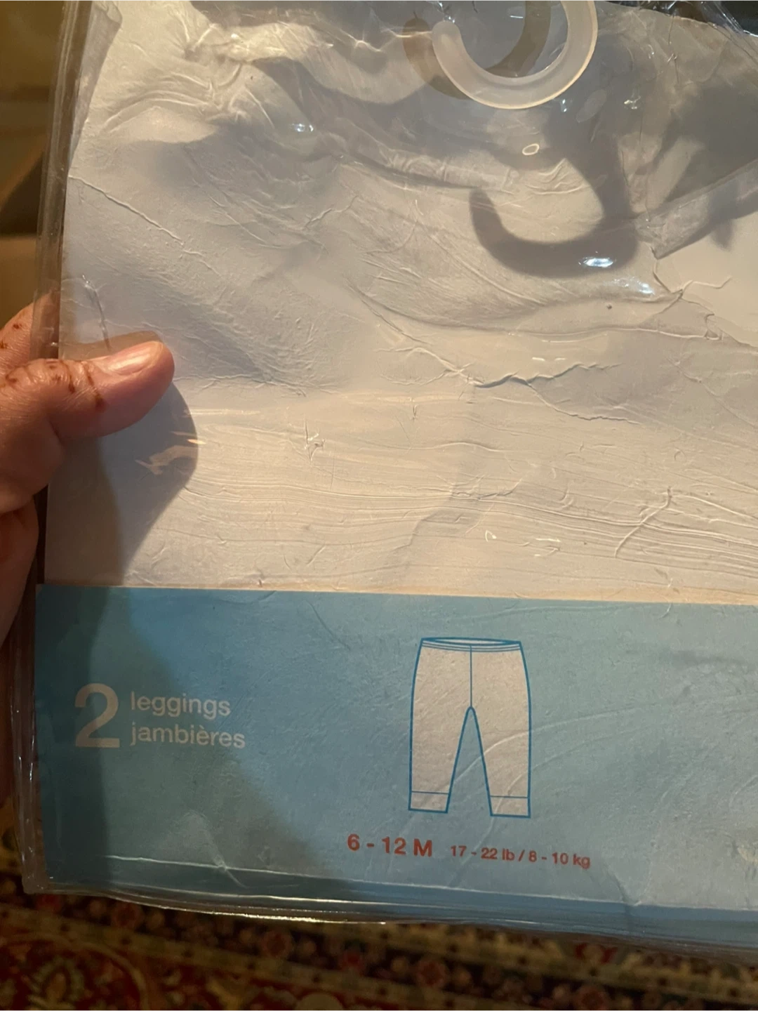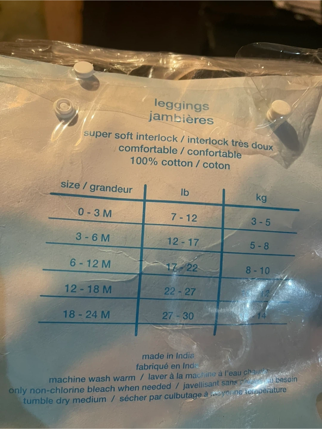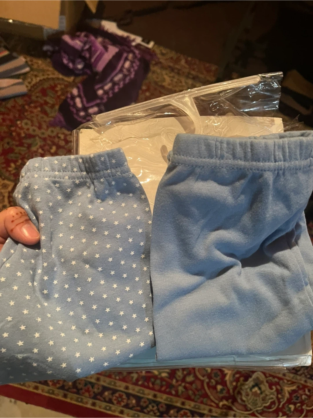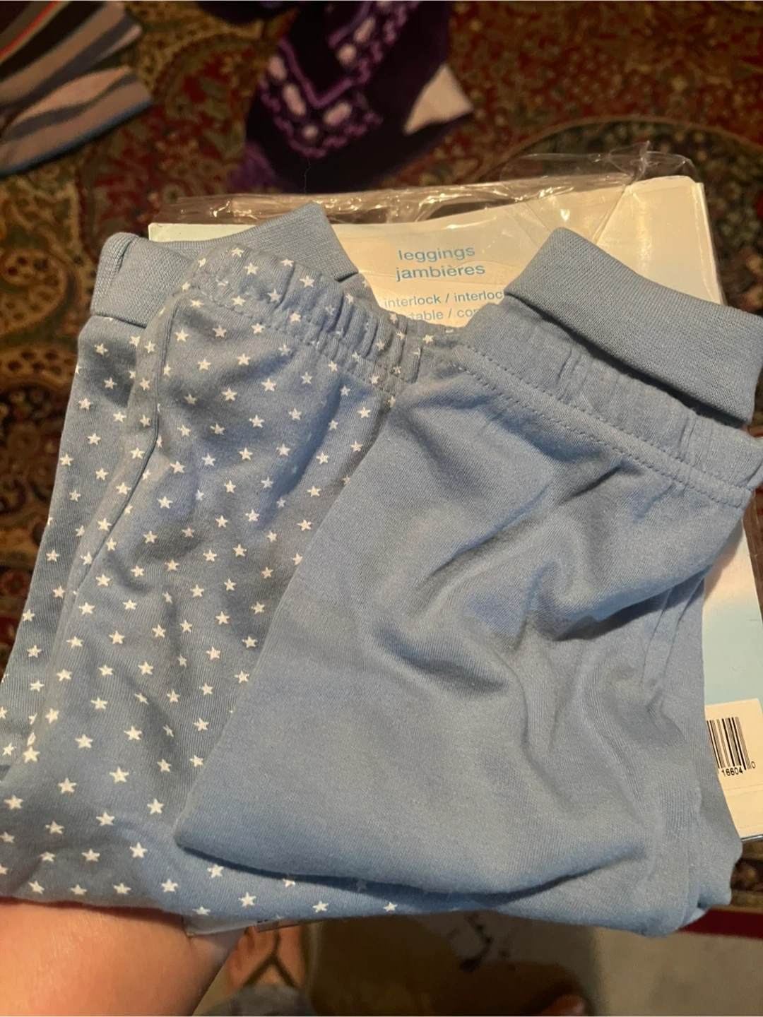 Brand new These are two pairs of super soft interlock leggings for babies. They're made from 100% cotton and are comfortable for everyday wear. One pair has a blue star print, and the other is solid blue. Fits babies 6-12 months, 17-22 lbs or 8-10 kg.