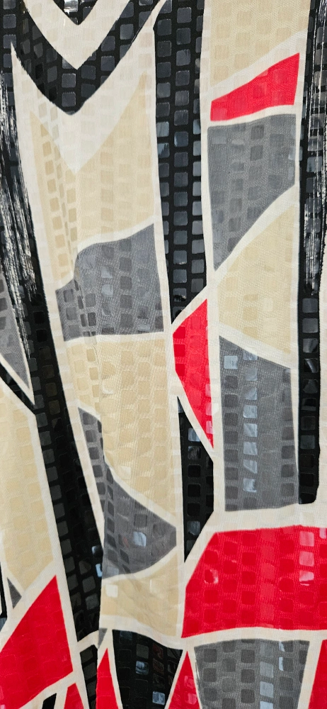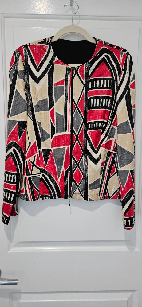 This is a fun and unique top with a bold geometric pattern in size Medium. The colours are red, black, grey, and beige. It's in fantastic condition and ready for a new home! Perfect for the Christmas and holiday season!
