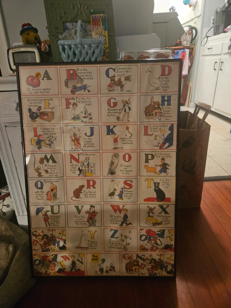 10I'm selling a vintage framed alphabet chart. It features charming illustrations for each letter, like 'A begins apples' and 'B is the barrow'. A unique piece for a classroom or child's room