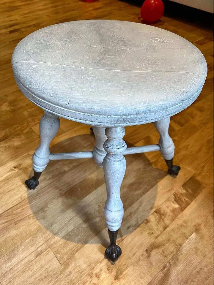 Has the original claw and glass ball legs. It’s been white washed to match our white washed antique piano. We have to use an adjustable stool since my child is learning to play the piano and this is the only reason we’re selling it. It’s perfect for adults but isn’t adjustable for kids.
