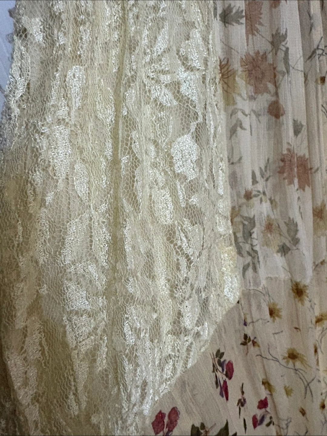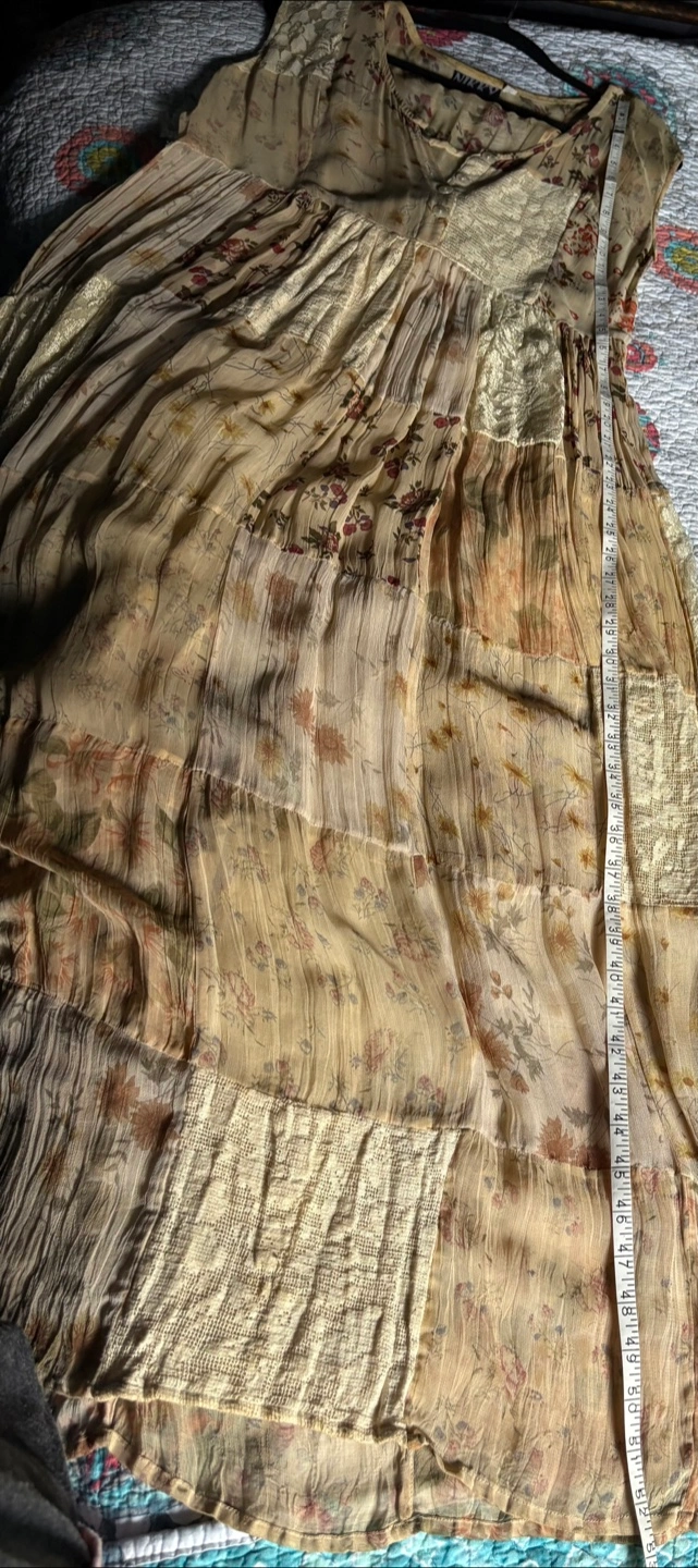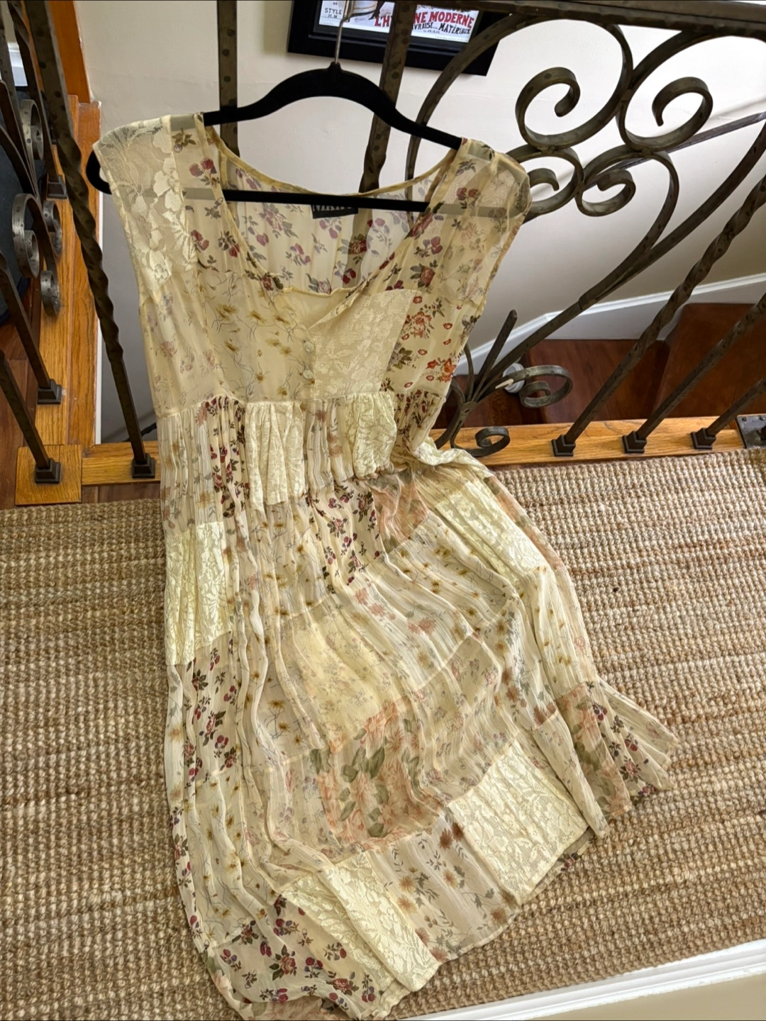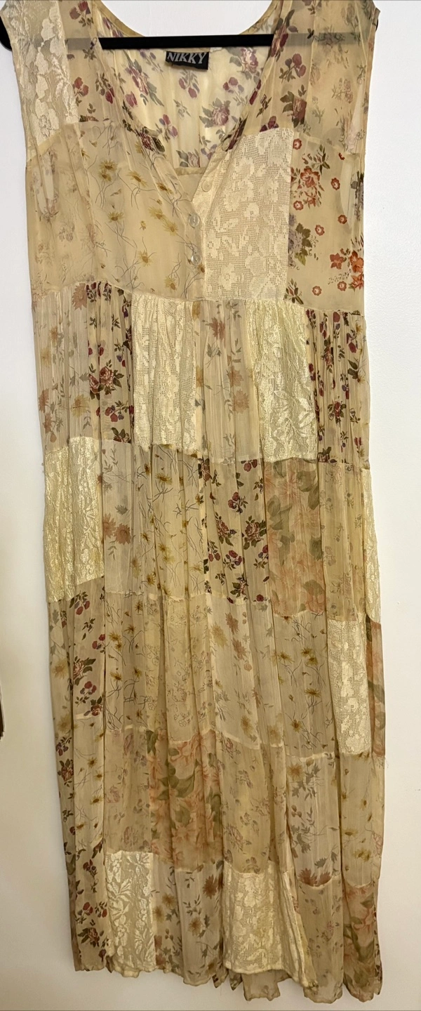 Beautiful Nikky dress featuring a unique floral and lace patchwork design. It's a size large and made of a lightweight, flowy material, perfect for summer or special occasions.