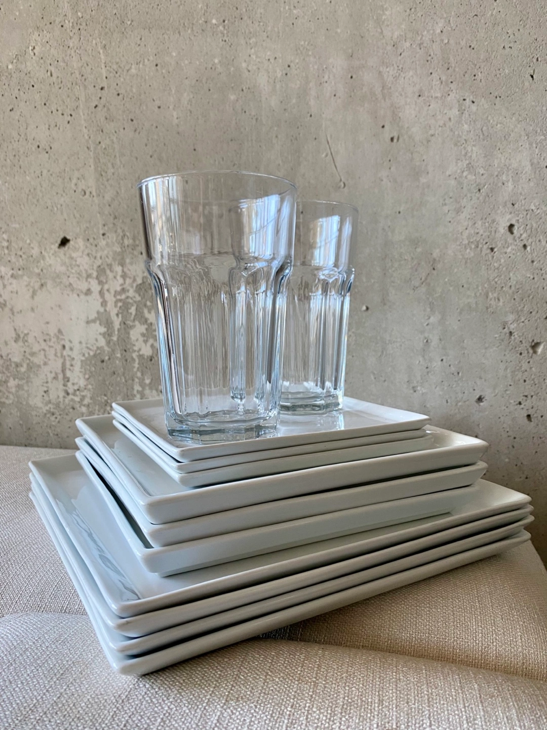 Selling a set of square white plates and 2x glasses. They're in great condition and ready for a new home! Includes 4 dinner plates, 3 salad plates and 3 dessert plates.