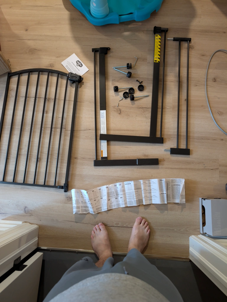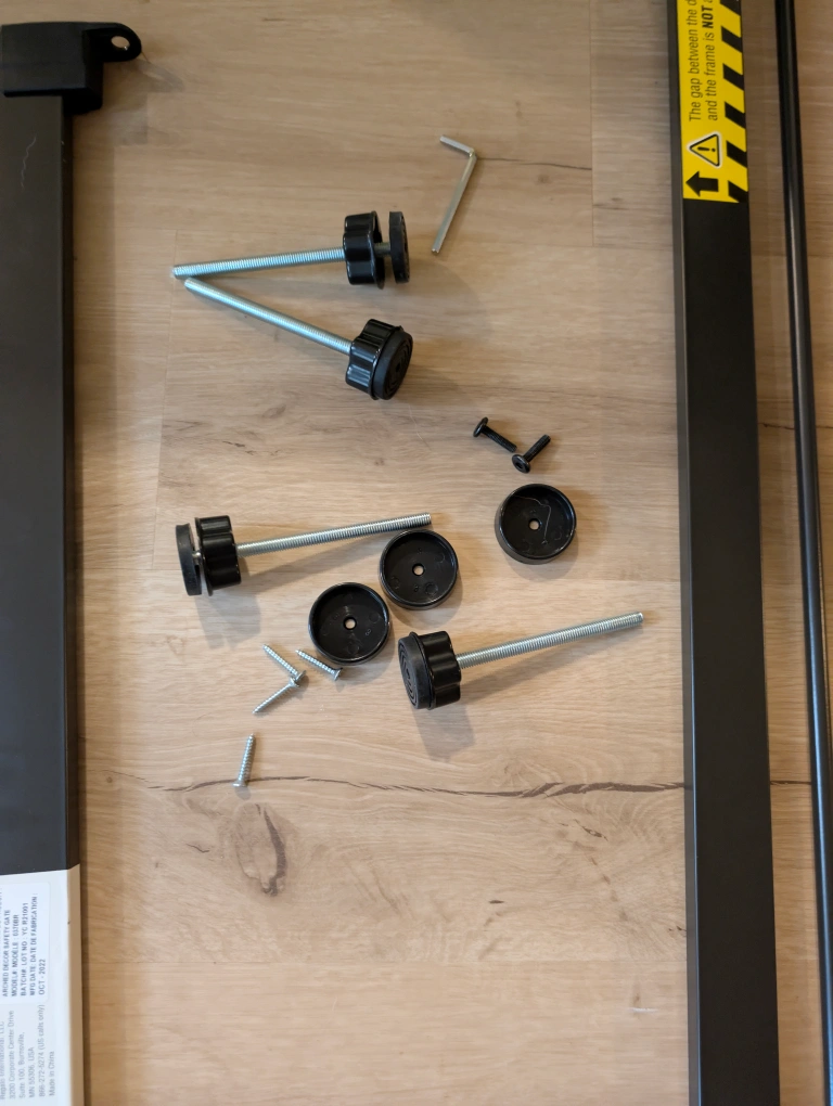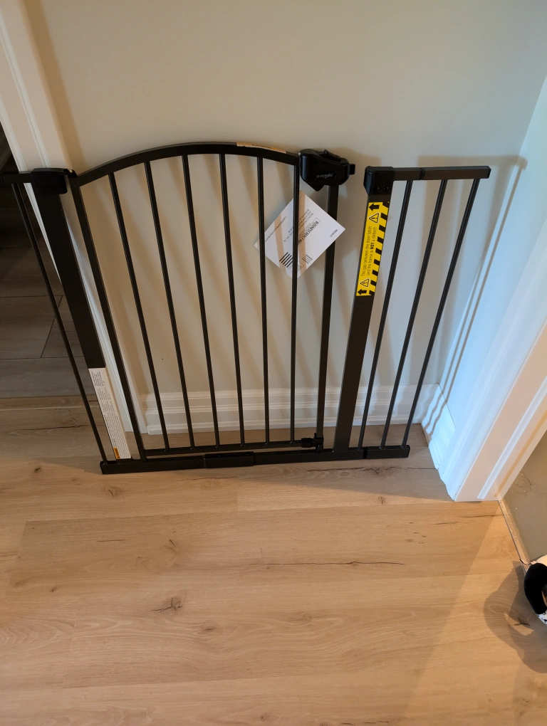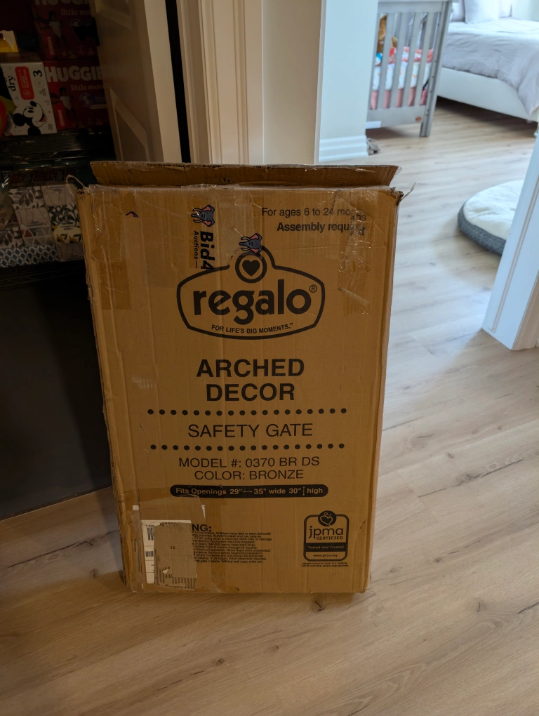 Selling a Regalo Arched Decor Safety Gate in bronze color. It fits openings 29"-35" wide and is 30" high. Recommended for ages 6 to 24 months. Assembly is required and the box is included!