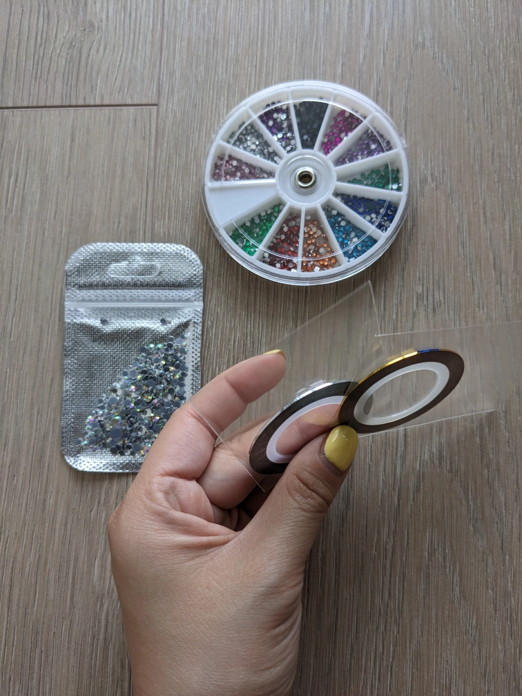 Selling a set of nail art supplies! Included are: - A wheel of colourful rhinestones - A bag of silver rhinestones - Two rolls of decorative tape Perfect for adding some sparkle and detail to your next manicure Meet at Gilmore station