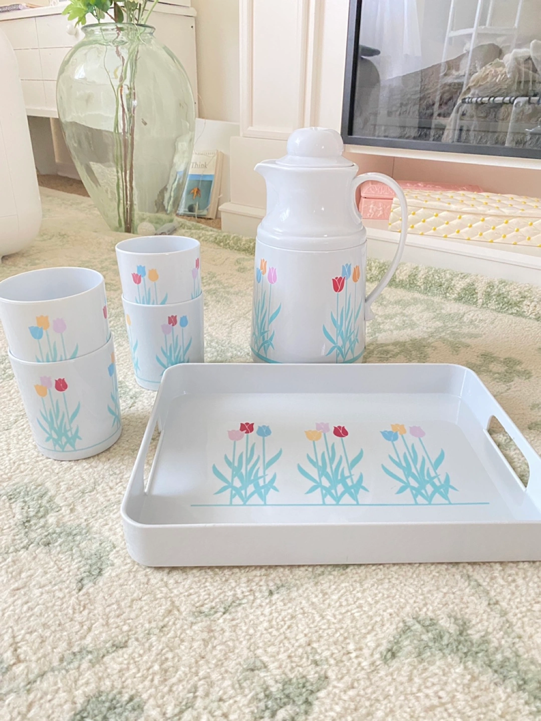 Selling a lovely vintage lemonade set, complete with four matching cups and a serving tray! The set features a charming floral design with tulips.