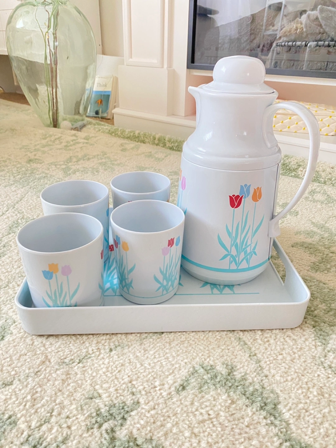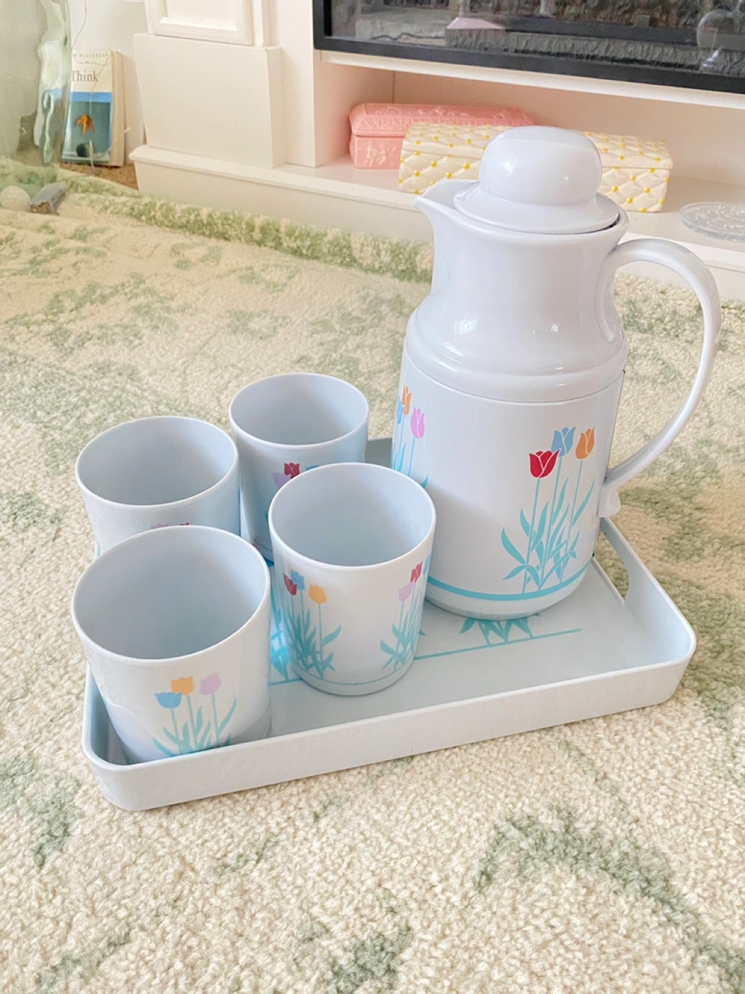 Selling a lovely vintage lemonade set, complete with four matching cups and a serving tray! The set features a charming floral design with tulips.