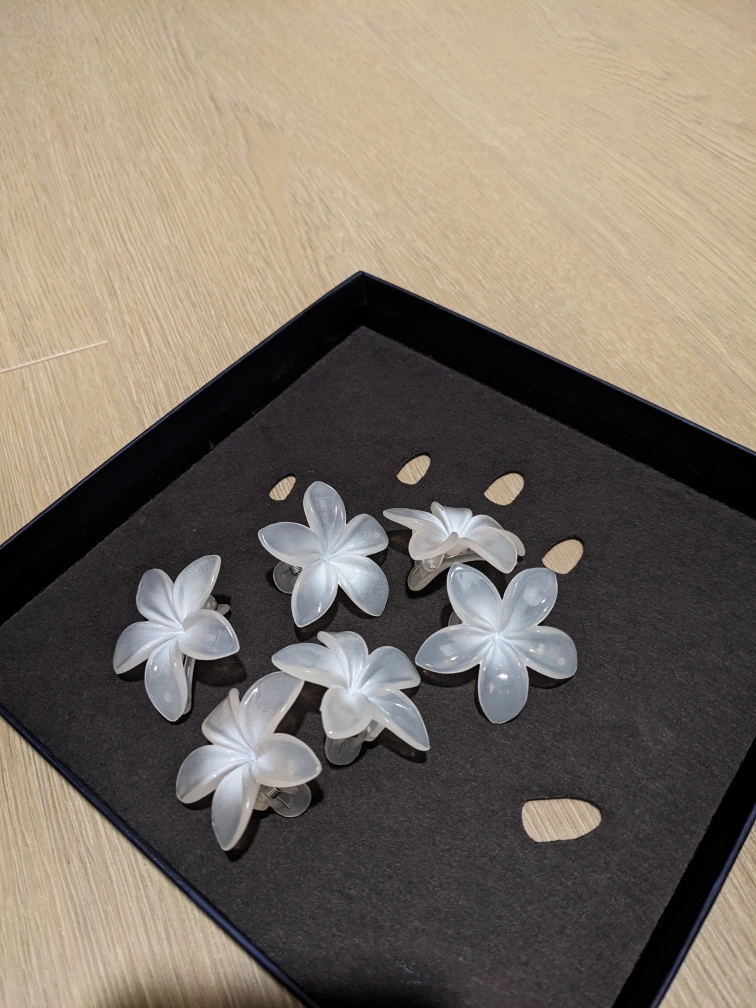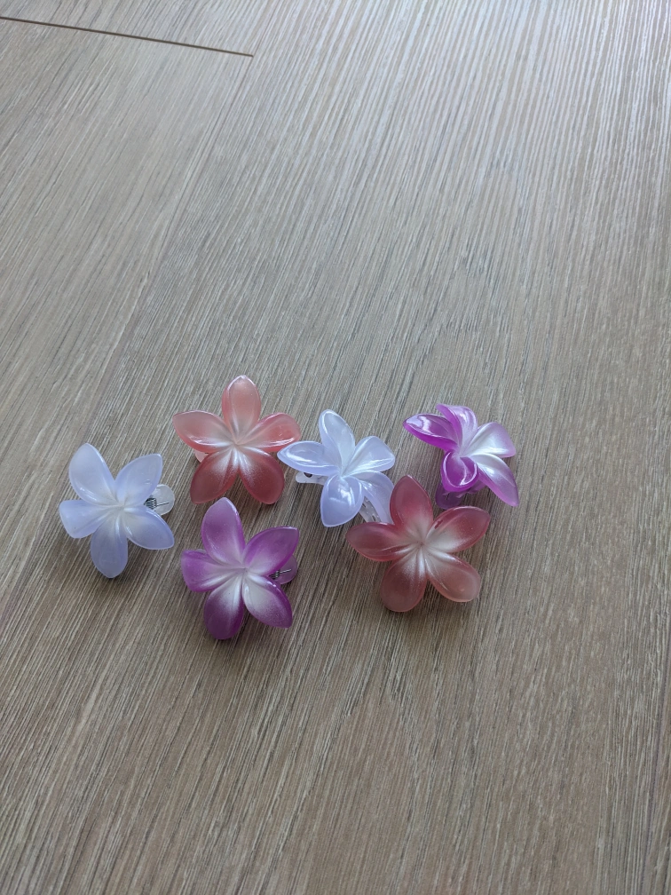 Selling a set of 6 flower hair clips! They're in great condition and come in a variety of colours, perfect for adding a touch of floral charm to any hairstyle. changes color in the sun