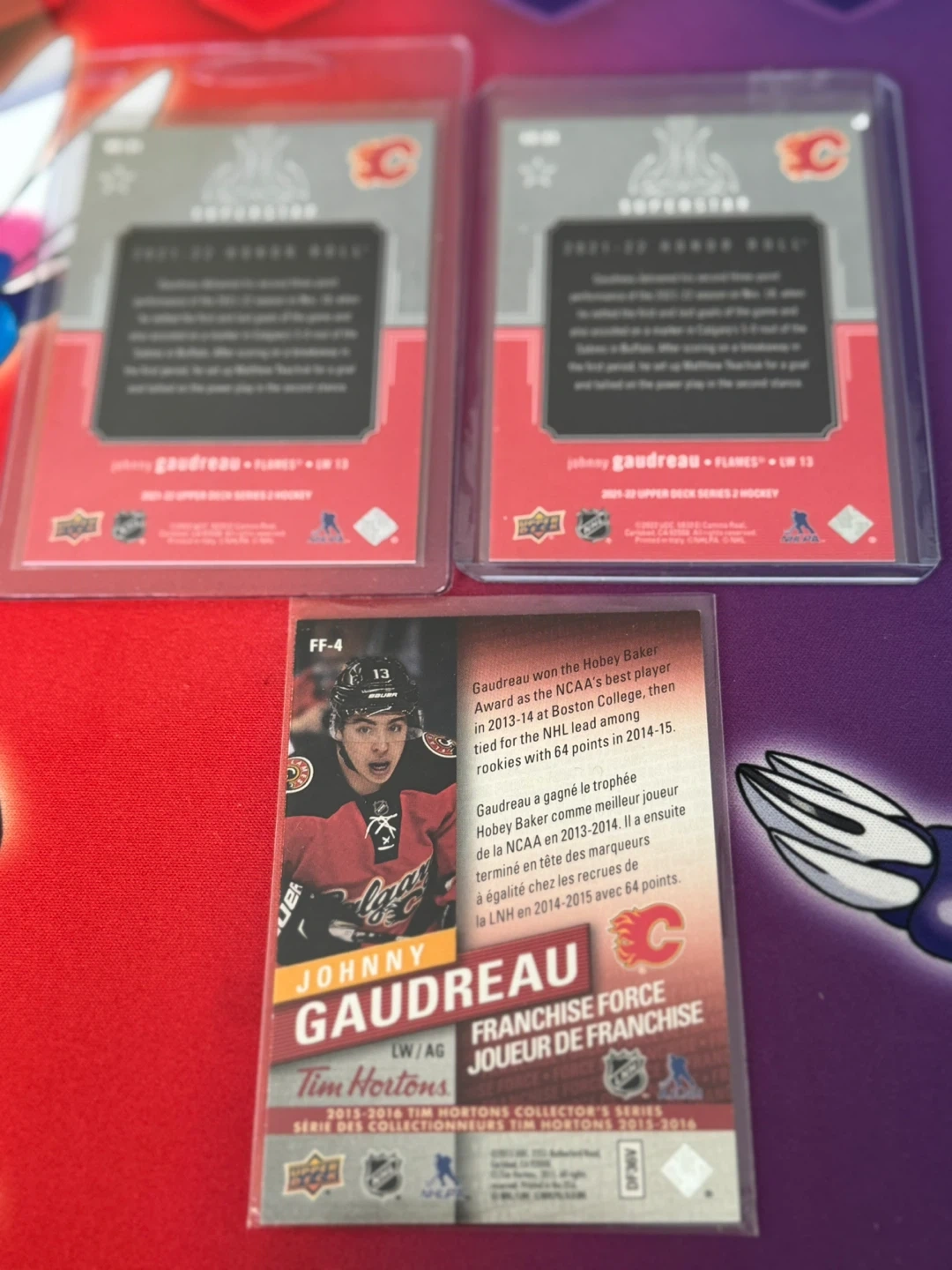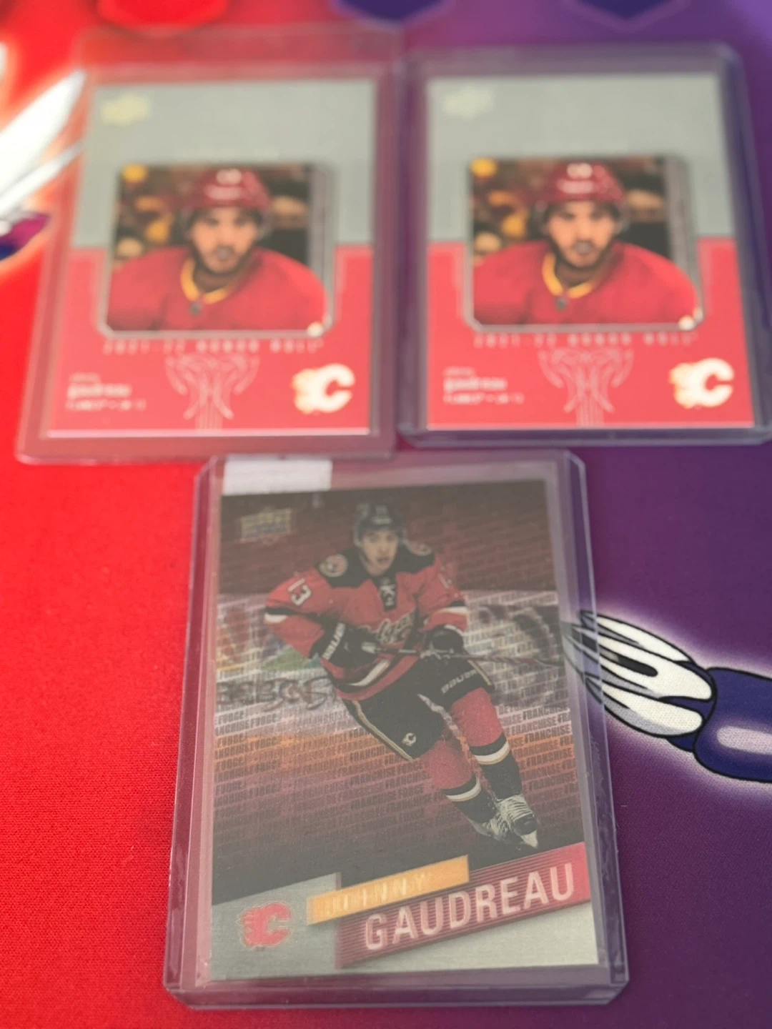 Selling a few Johnny Gaudreau hockey cards. One is from the 2015-2016 Tim Hortons collector's series, and two are from the 2021-22 Upper Deck Series 2 Hockey set. Great for any Flames fan!