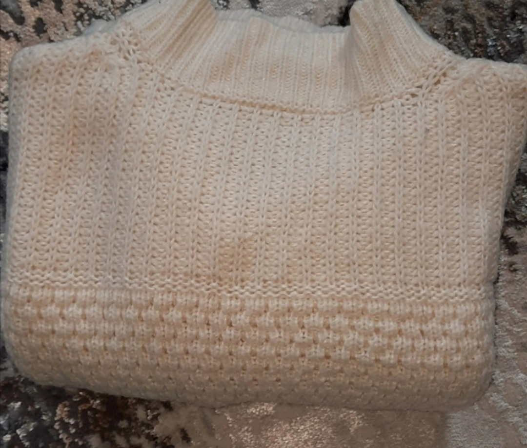 A cozy cream-coloured knit sweater, perfect for staying warm and stylish. It features a unique pattern and comfortable fit, great for layering or wearing on its own. It's in great condition and ready for a new home!