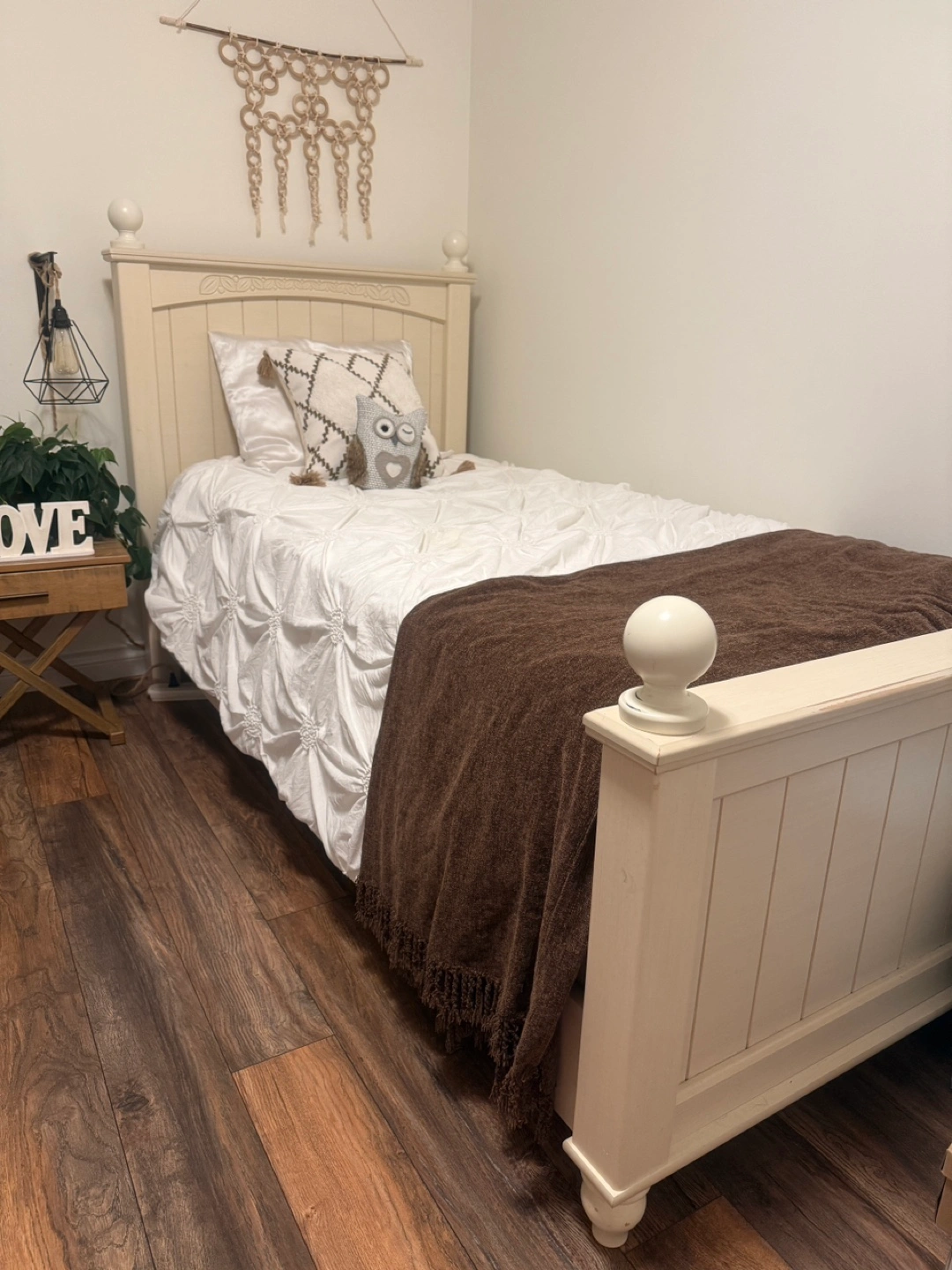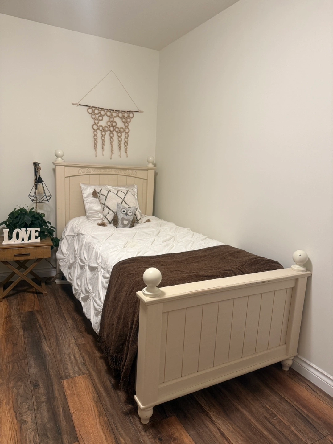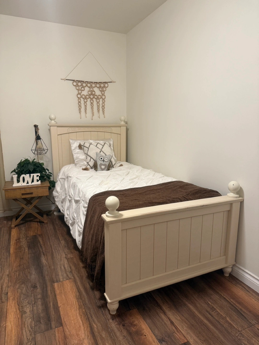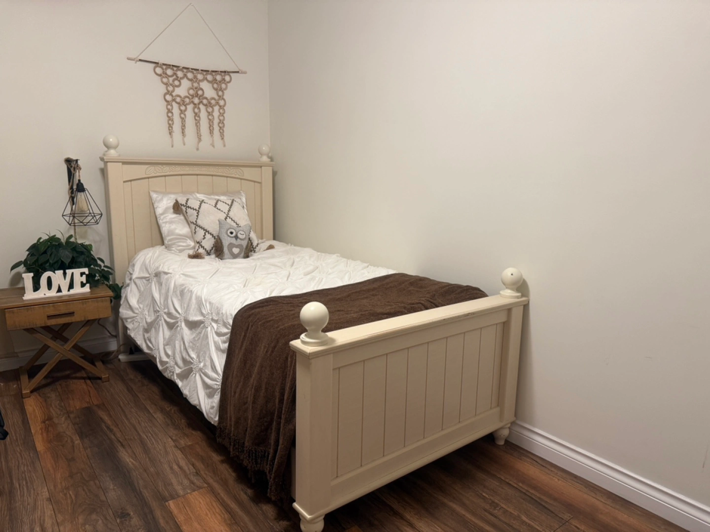 Ashley cream-colored twin bed frame with mattress. Sturdy and durable, ideal for a kid’s room or guest room.