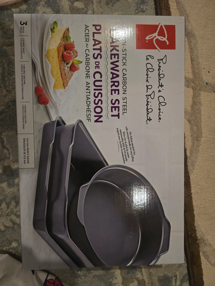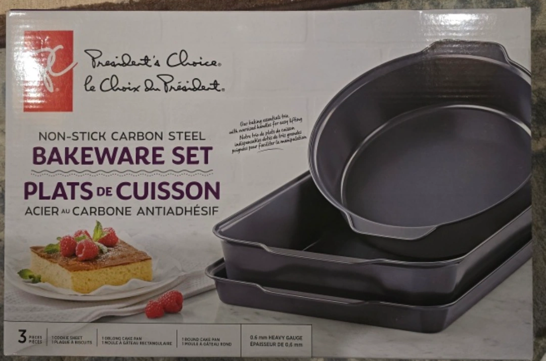 I'm selling a brand new President's Choice Non-Stick Carbon Steel Bakeware Set! This set includes 3 pieces: a cookie sheet, a oblong cake pan, and a round cake pan. The bakeware is made with 0.6 mm heavy gauge carbon steel for even heat distribution and lasting durability. Perfect for all your baking needs!