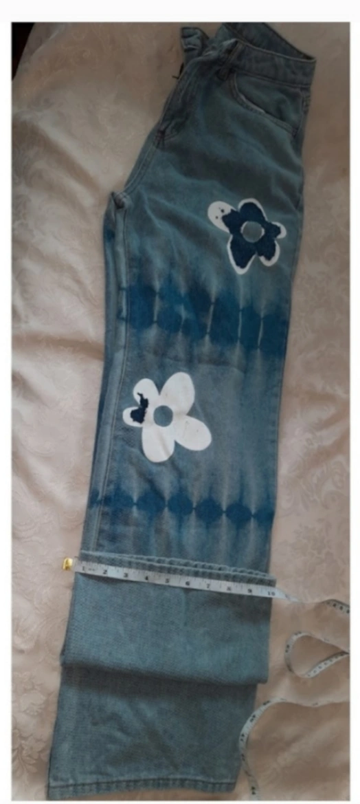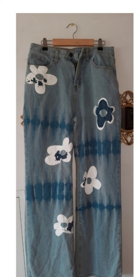 These are a pair of flate leg jeans with a unique hand-painted floral design. They feature a light blue denim with a tie-dye effect and white and blue floral patterns. A fun and stylish addition to any wardrobe!