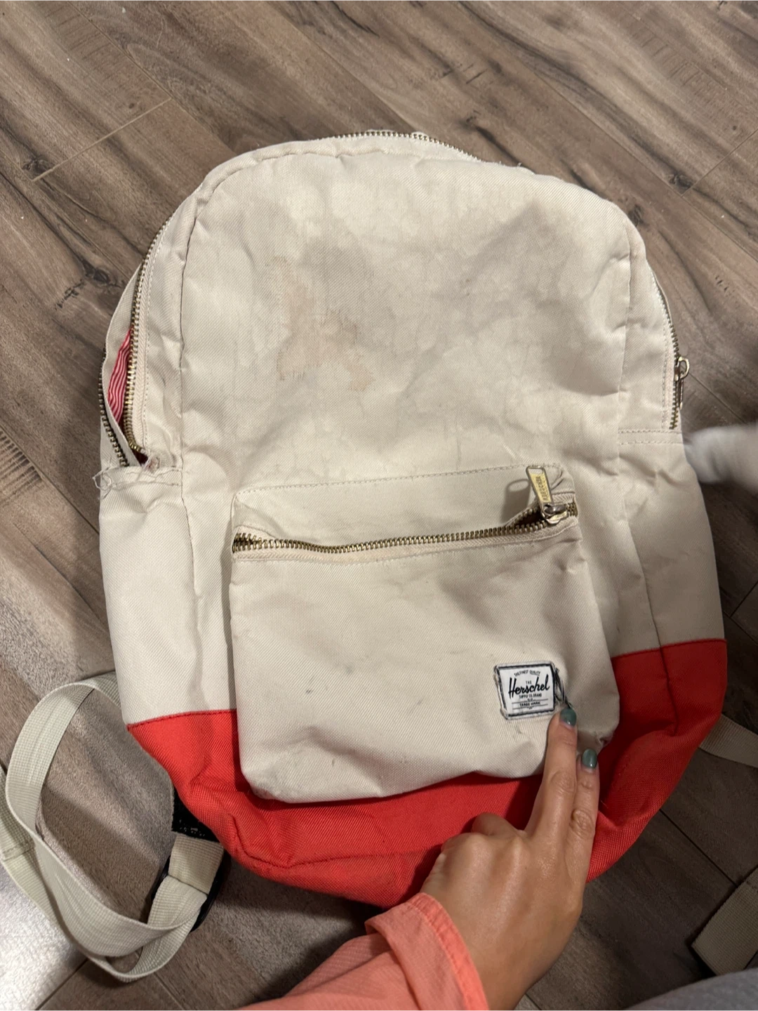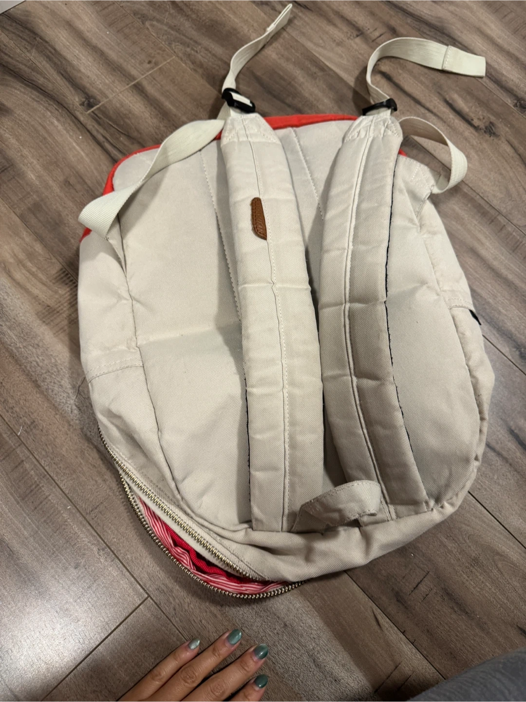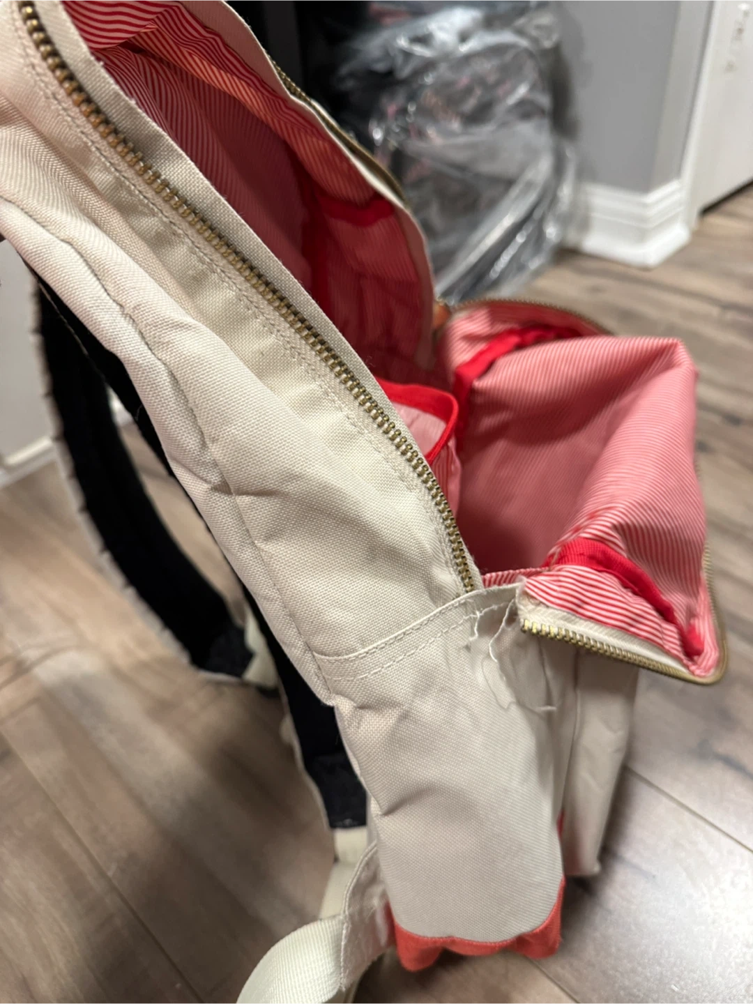 Herschel backpack in beige and red. It's got a red and white striped interior. There are some signs of use on the front, but it's still a useful backpack!