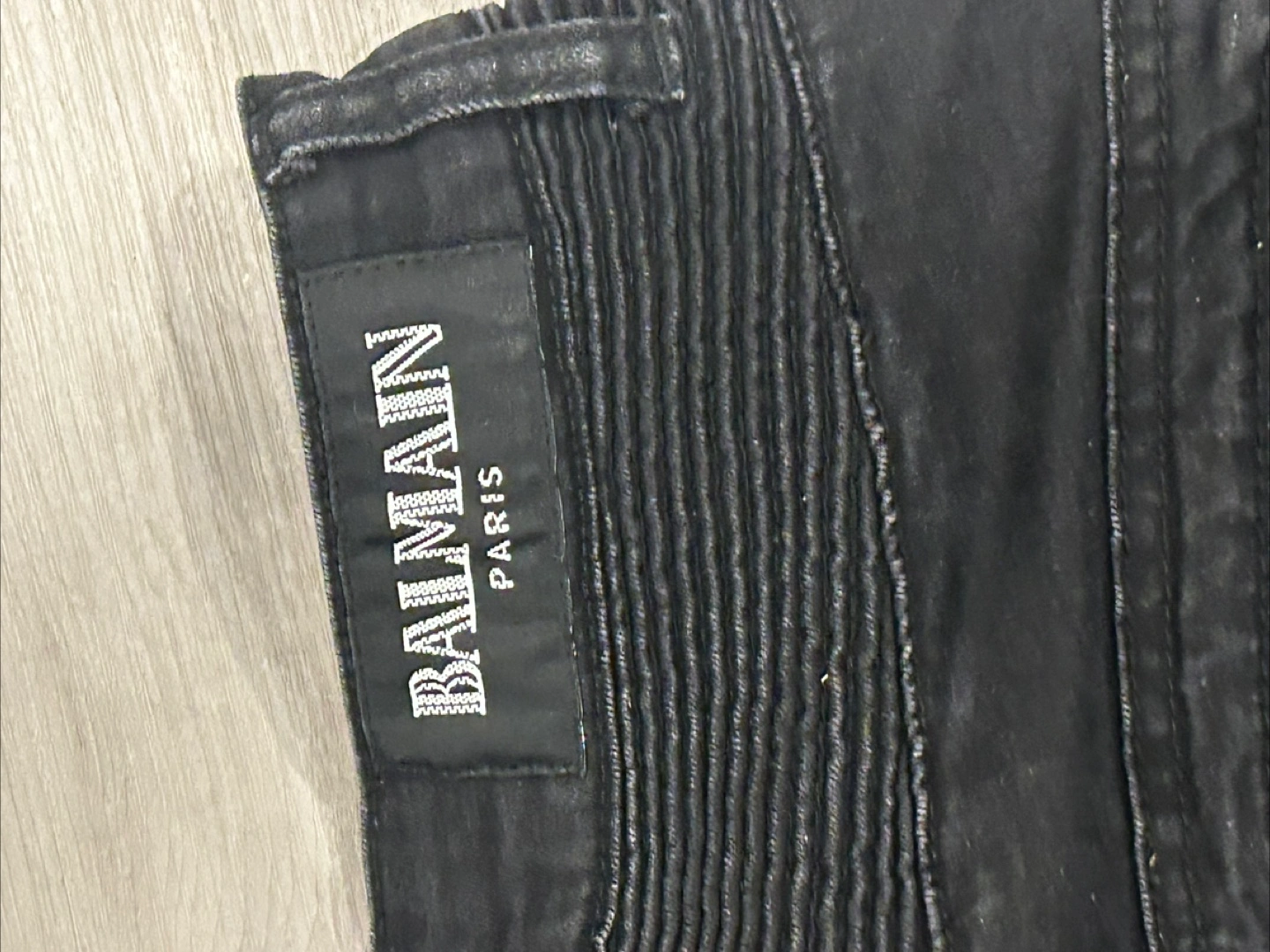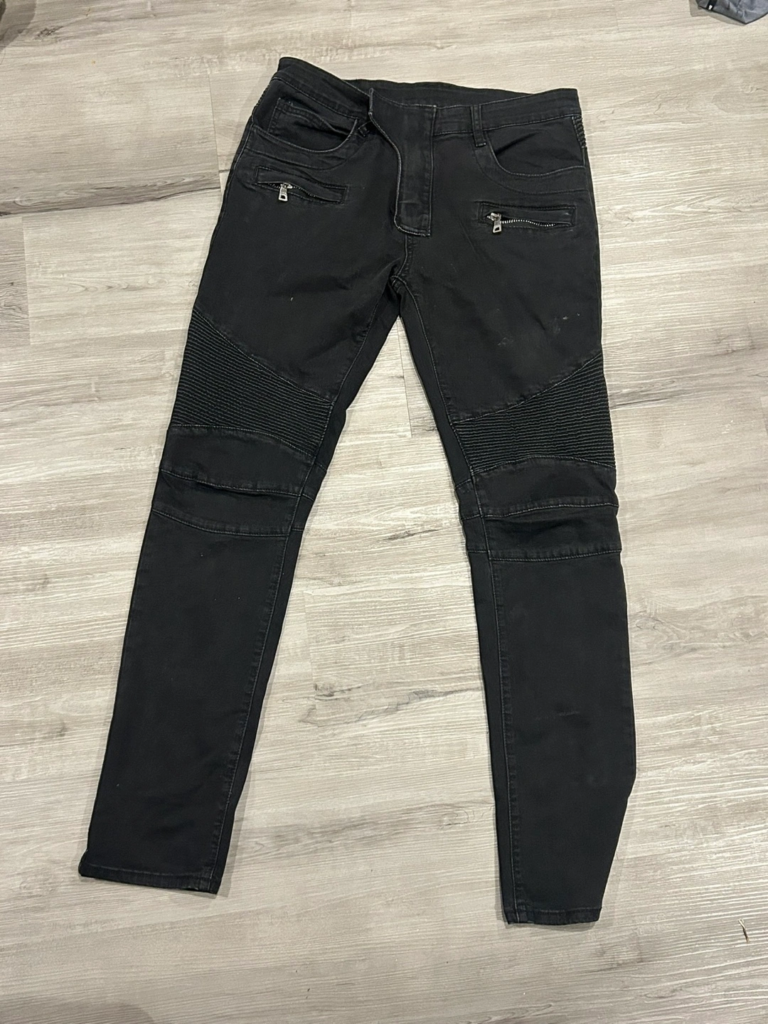 Selling a pair of Balmain black biker jeans in size 34. They're made in Italy from 100% cotton. These jeans have a cool, edgy look with the biker detailing on the legs. Great for adding some style to your wardrobe!