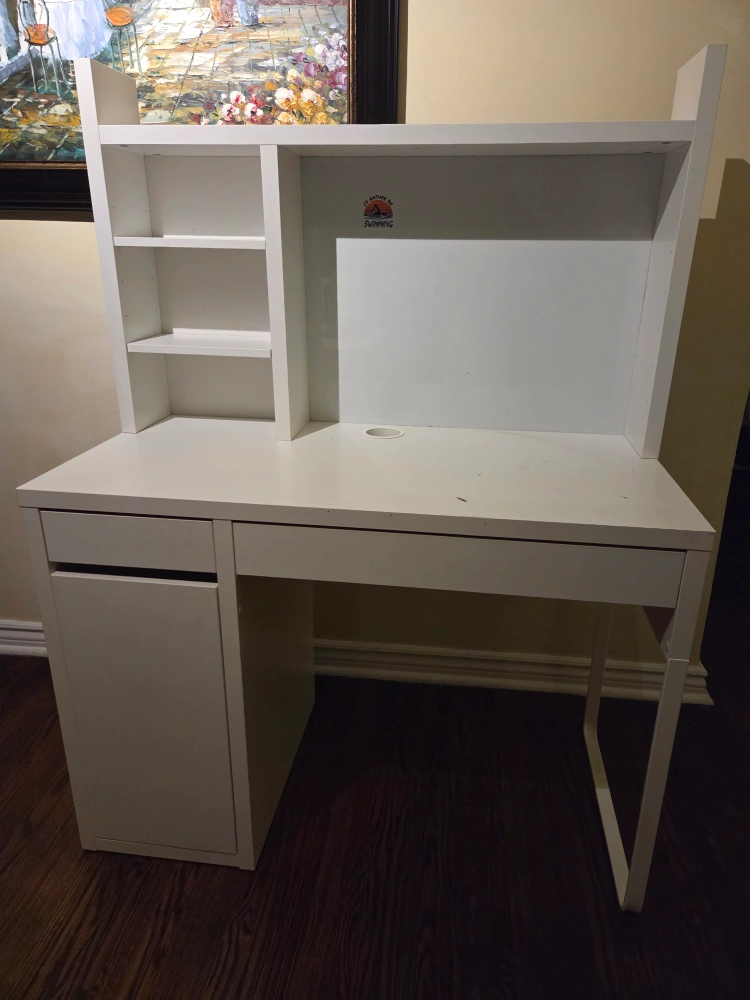Selling a white desk with a hutch! It features a clean design with shelving on one side and a large, smooth surface. There's also a drawer for storage. It's perfect for a home office or study space