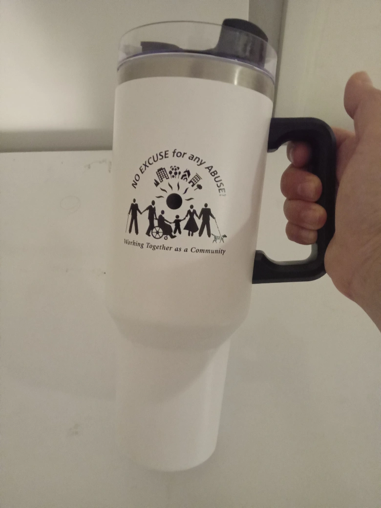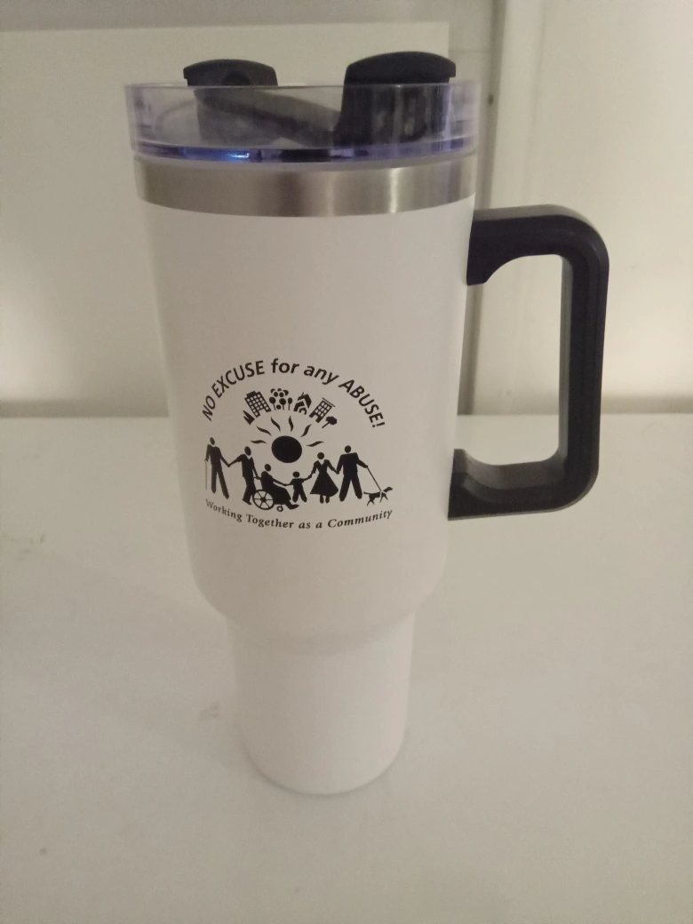 277I'm selling a large white travel mug with a handle. It has a clear lid and a design that says "No Excuse for any Abuse! Working Together as a Community". It's in great shape and ready for a new home!
